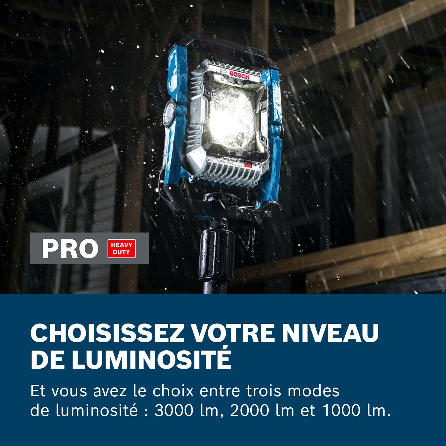 L'autonomie dépend de la capacité de la batterie 18V utilisée. Avec une batterie haute capacité, le projecteur maintient son flux de 3000 lumens pendant plusieurs heures sans baisse d'intensité. Le passage au mode économique permet de doubler, voire de tripler cette durée pour couvrir une journée complète.Le projecteur peut-il être utilisé en extérieur sous la pluie ?