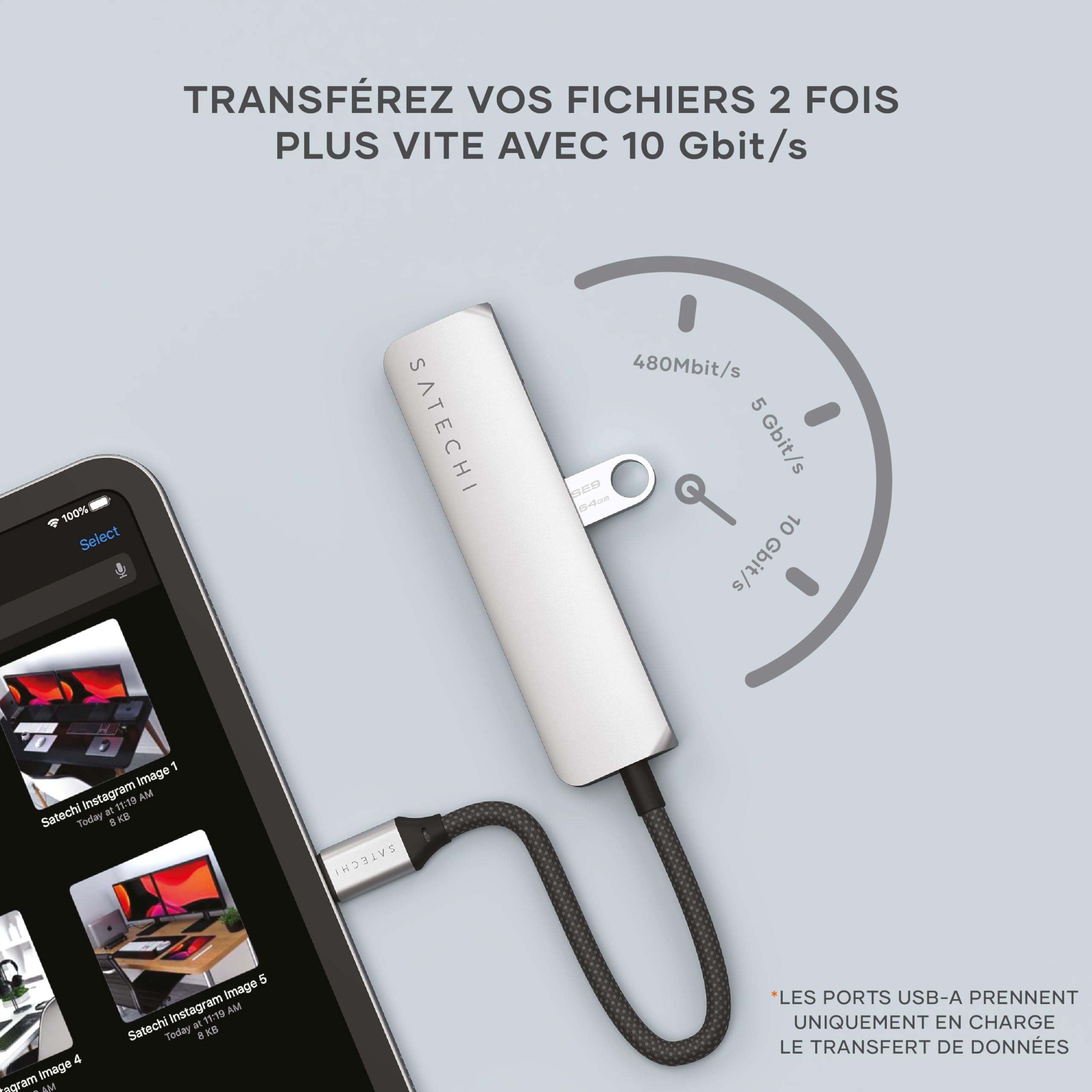 Intégré dans le Satechi Satechi 4-in-1, vous trouverez deux ports USB 3.2 Gen 2 qui assurent des transferts de données ultra-rapides et sécurisés jusqu'à 10 Gb/s. Ces interfaces vous permettent de connecter simultanément plusieurs périphériques et de partager aisément fichiers et ressources sans compromis sur la rapidité. La technologie USB 3.2 Gen 2 se positionne comme un standard incontournable des performances actuelles, garantissant une réactivité immédiate, même lors d’opérations intensives. Sa conception solide et durable assure une longévité remarquable qui ravira les professionnels en quête d'efficacité et de constance.