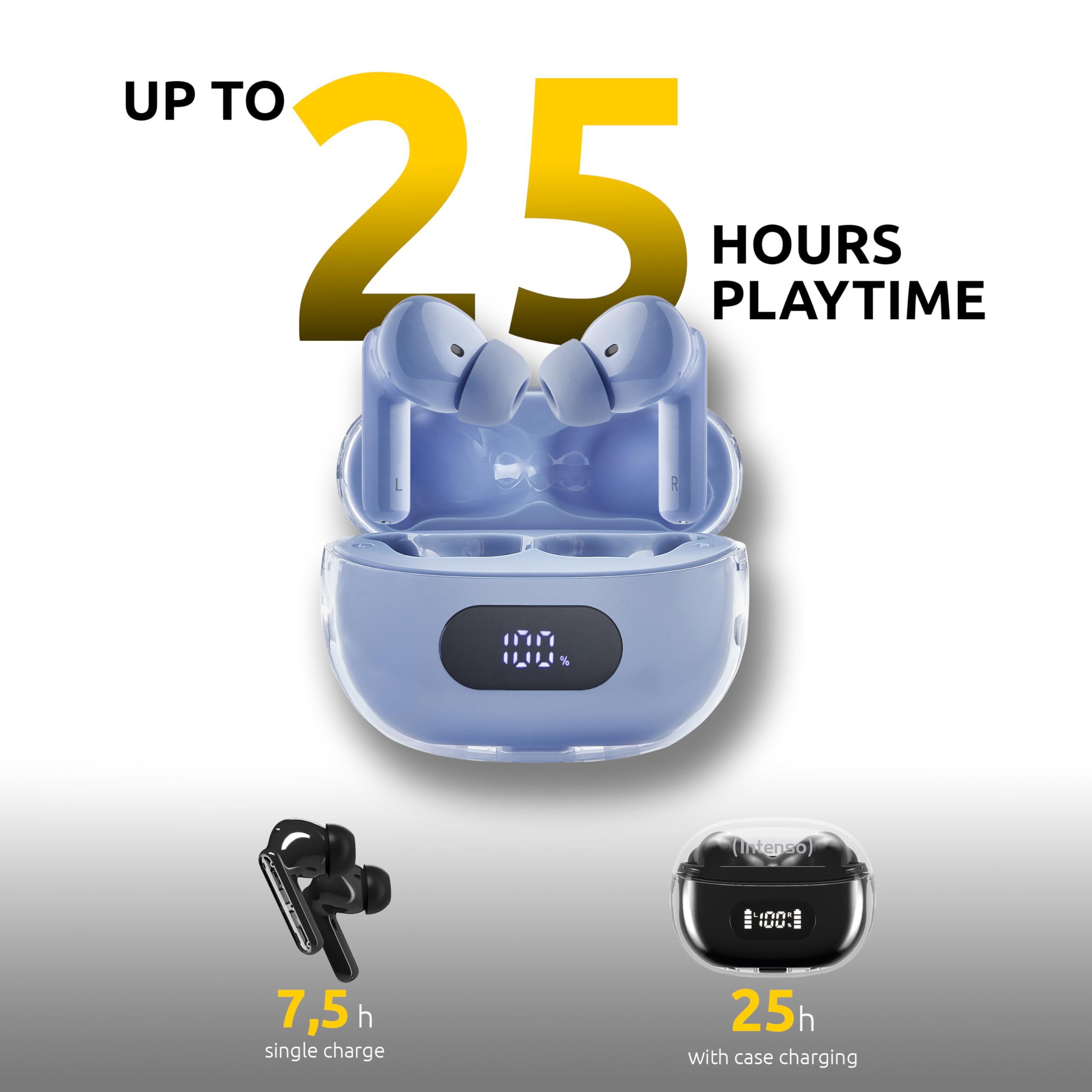 Avec une autonomie d’écoute continue de 6 heures et un étui de chargement fournissant jusqu’à 20 heures d’utilisation, les INTENSO Buds Plus T315AE vous accompagnent toute la journée sans interruption. La charge rapide permet de récupérer rapidement l’énergie nécessaire pour profiter d’une écoute prolongée, et ce, même en cas d’utilisation intensive. Les indicateurs lumineux intégrés vous informent de l’état de la batterie, assurant ainsi une gestion optimale de l’énergie lors de vos déplacements.