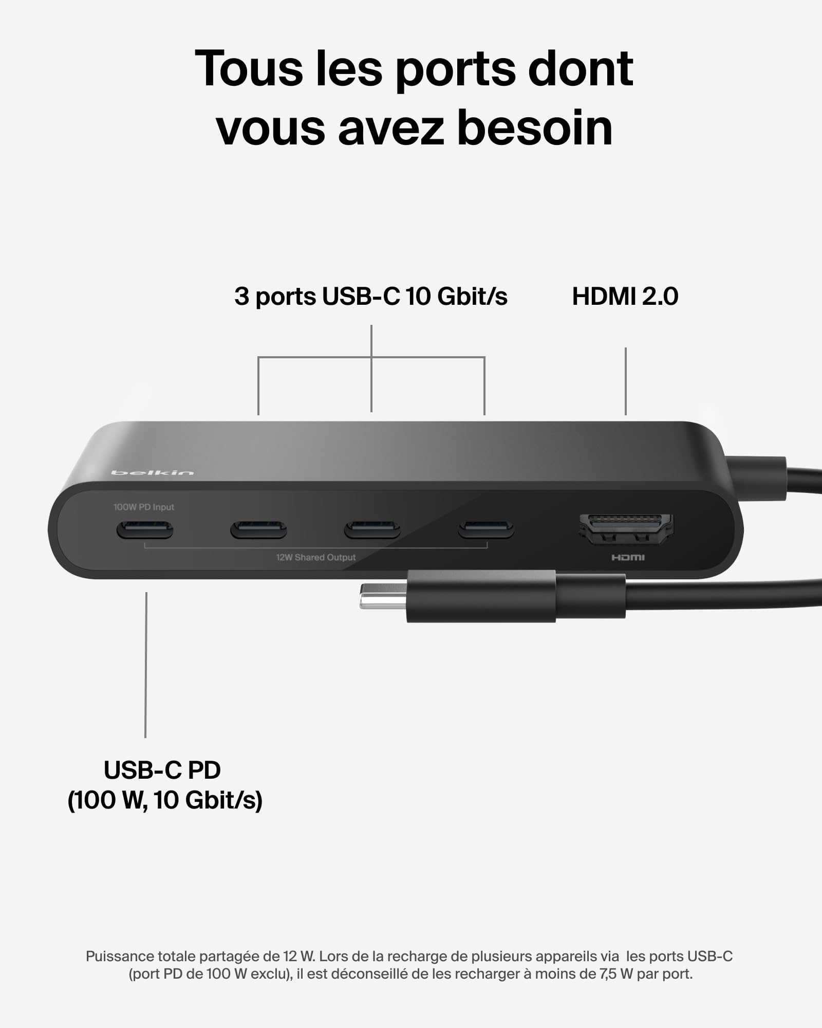 Le BELKIN 5-Port USB-C Hub with 4K HDMI offre une solution complète pour élargir vos possibilités de connexion. Grâce à ses 5 ports USB-C, il combine rapidité et compatibilité. Il permet la connexion simultanée de plusieurs périphériques sans compromis sur la vitesse. Ce concentrateur supporte notamment le transfert de données à la vitesse fulgurante de 10 Gbps, répondant aux besoins les plus exigeants. Avec ce hub, l’expansion de votre poste de travail devient intuitive et optimisée.