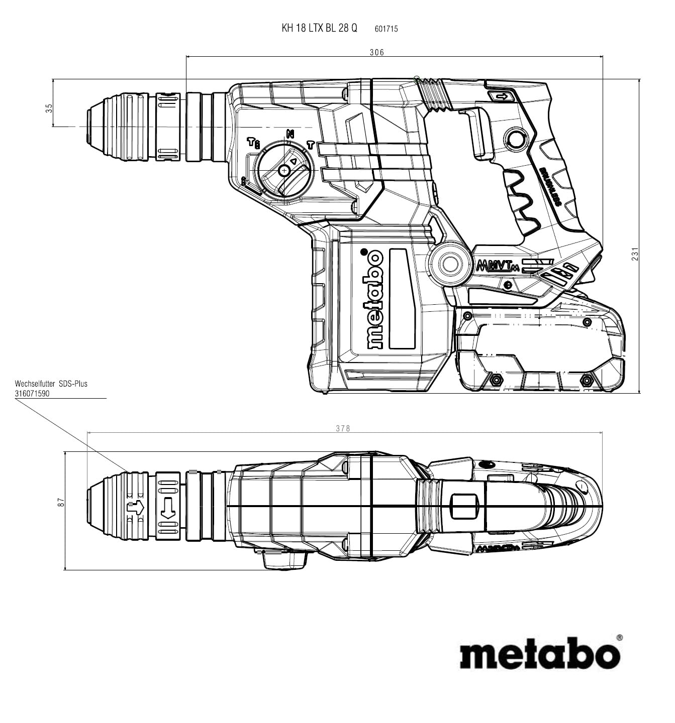 Caractéristiques :Puissance de perçage, efficacité et durée de vie maximales grâce à la technologie Brushless et au mécanisme de percussion haute performancePerçage sans poussière avec le système compact d'aspiration des poussières ISA 28Marteau combiné avec 3 fonctions : Perçage au marteau, perçage et burinageMetabo VibraTech (MVT) : travail sans danger pour la santé et sans fatigue, même en utilisation continueMetabo Quick : changement rapide et sans outil du mandrin de perçage pour travailler avec des forets SDS-plus et cylindriquesSystème électronique à ondes pleines Vario-Tacho-Constamatic (VTC) pour travailler avec des vitesses de rotation adaptées aux matériaux et qui restent constantes sous charge.Réduction optionnelle de la vitesse et de l'énergie de frappe pour travailler dans des matériaux plus tendresDémarrage électronique en douceur pour un perçage précisDouble sécurité en cas de blocage de la perceuse : pas de kick-back grâce au découplage mécanique et arrêt instantané commandé par capteurLampe de travail LED pour une visibilité optimale sur le lieu de perçageDe nombreuses marques, un système de batterie : ce produit peut être combiné avec tous les packs de batteries 18V et les chargeurs des marques CAS : www.cordless-alliance-system.comContenu de la Livraison :Aspirateur de poussière intégré ISA 28Tête d'aspiration de rechangeMandrin à marteau pour outils avec extrémité d'insertion SDS-plusMandrin à serrage rapide pour outils à queue cylindriquePoignée supplémentaire caoutchoutéeButée de profondeur de perçage2 packs de batteries LiHD (18 V/5,5 Ah)Chargeur rapide ASC 145 "AIR COOLEDMetaBOX 185 XLLes outils électriques Metabo ont une longévité tout à fait exceptionnelle. Comme ceux-ci ont rarement besoin d'être réparés, Metabo a développé pour vous une garantie supplémentaire : la garantie XXL. Si vous vous enregistrez, la garantie normale est étendue jusqu'à 3 ans. La facture d'achat, ainsi que le certificat de garantie XXL, que vous pourrez rédiger pour vos outils après l'enregistrement, sont une condition préalable. L'enregistrement est possible jusqu'à 4 semaines après l'achat. Enregistrez votre produit maintenant sur www.metabo-service.com