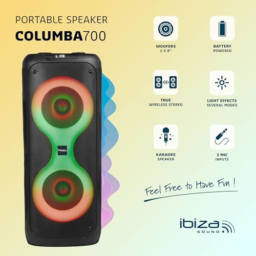 Dotée d’une connectivité Bluetooth avancée, cette enceinte assure un streaming sans fil stable et de haute qualité depuis tous vos appareils compatibles. L’Ibiza COLUMBA700 propose également plusieurs entrées physiques : un port USB-C pour recharger la batterie et connecter des sources audio, une entrée microSD, une entrée auxiliaire 3,5 mm (AUX) pour brancher facilement vos lecteurs audio, ainsi que deux entrées microphone permettant des usages variés, notamment pour des annonces ou du chant.