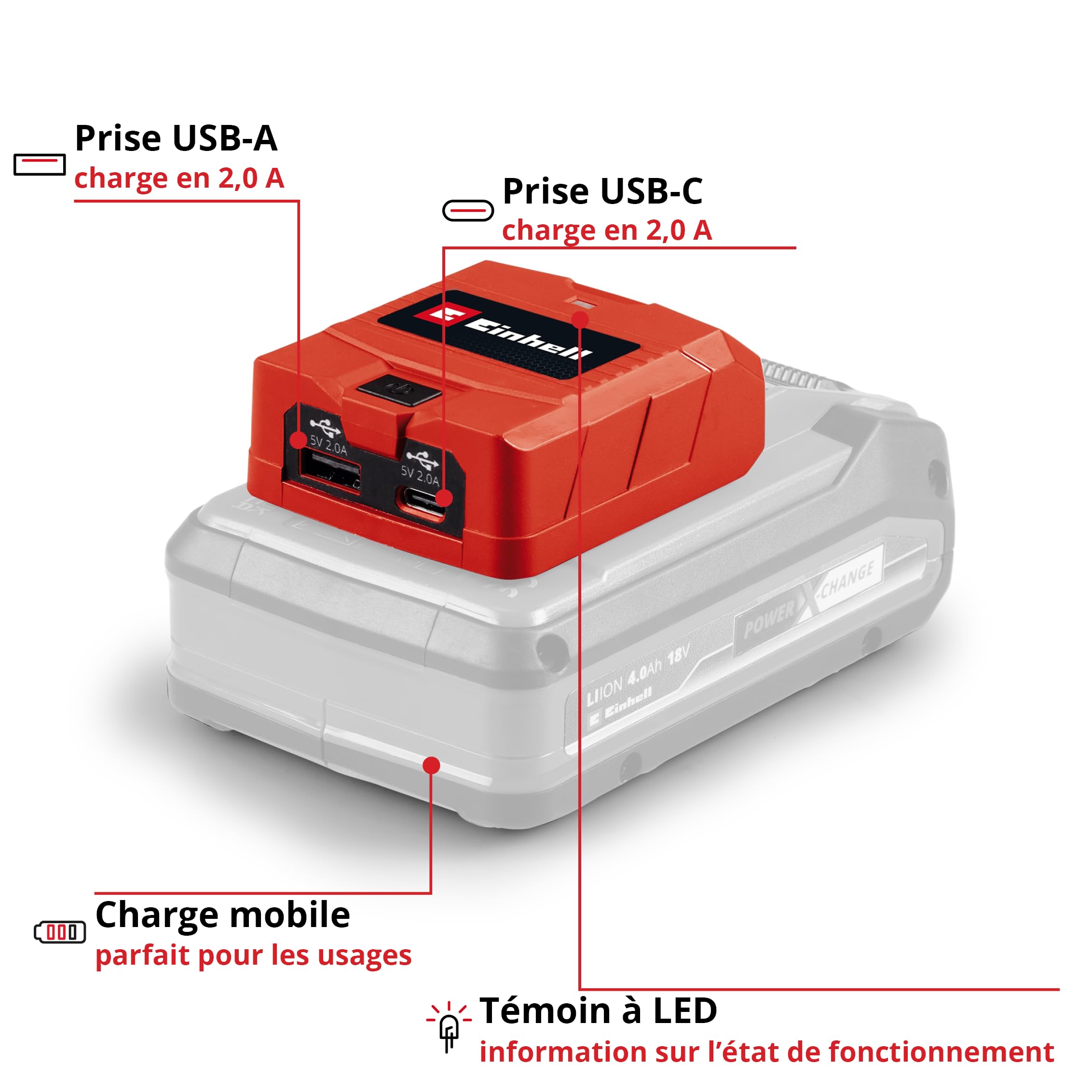L’Einhell Power X-Change USB-Akku-Adapter TC-CP 18 Li USB A/C-Solo se distingue par sa parfaite intégration au système Power X-Change. Ce système est une véritable révolution pour tous les utilisateurs d’outils sans fil Einhell. Grâce à cette technologie, la batterie lithium-ion interchangeable offre une compatibilité optimale avec plus de 200 appareils différents. Cette adaptabilité permet d’utiliser une seule batterie pour alimenter divers outils, simplifiant ainsi la gestion de l’énergie et assurant une continuité de travail sans interruption.