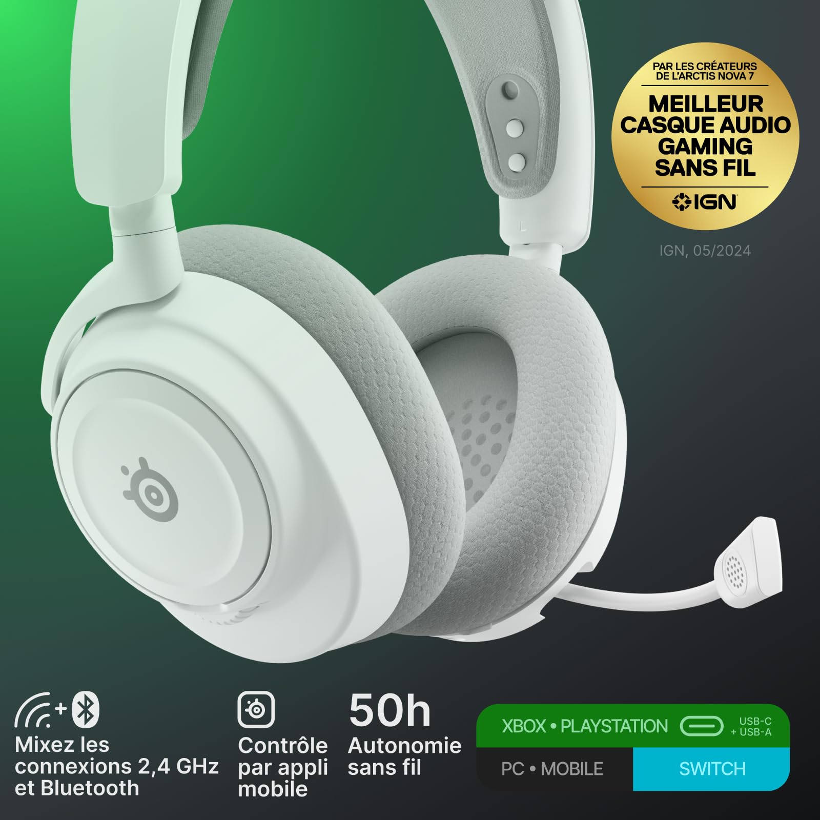 L’Arctis Nova 7X Gen 2 Blanc se distingue par sa compatibilité étendue, incluant PS4, PS5, PC, Switch, Xbox One et Xbox Series.