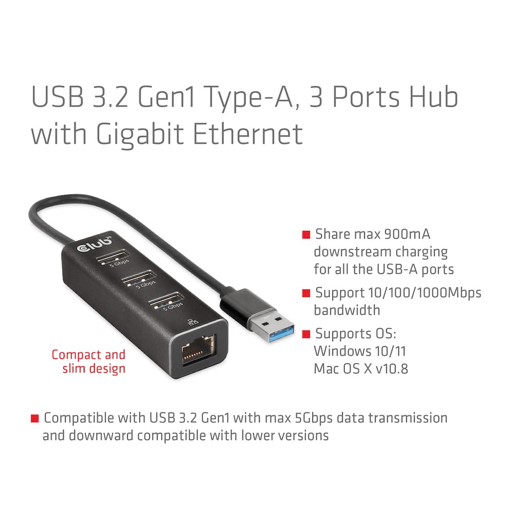 Le CLUB 3D Club3D Adapter USB 3.2 Typ A > 3x USB 3.2 Typ A/LAN retail révolutionne votre expérience de branchement avec une compatibilité étendue. Ce produit permet de transformer un unique port USB 3.2 Typ A en trois ports USB 3.2 Typ A supplémentaires, tout en intégrant un port LAN RJ-45 Gigabit. Vous bénéficiez ainsi d’une connectivité multiple et rapide, idéale pour étendre vos périphériques tout en assurant une connexion réseau filaire stable et performante. Cette double fonctionnalité élimine la nécessité de solutions distinctes.