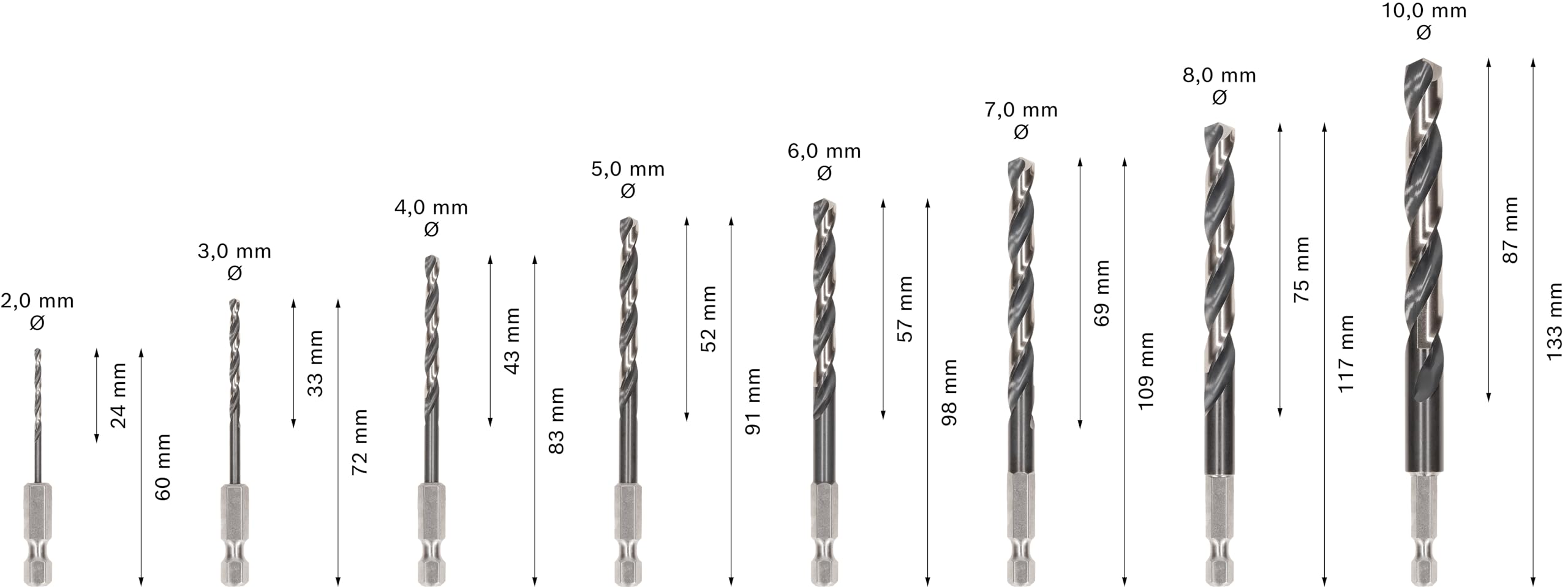 Le jeu comprend 8 tailles essentielles, allant de 1,5 mm à 6,5 mm, couvrant un large spectre de besoins professionnels. Chaque foret présente une queue cylindrique standard, garantissant une compatibilité universelle avec la plupart des mandrins. Cette configuration facilite le changement rapide et assure une prise en main sûre, même dans les environnements de travail exigeants. L’usinage précis maximise la concentricité pour un perçage droit et sans effort.