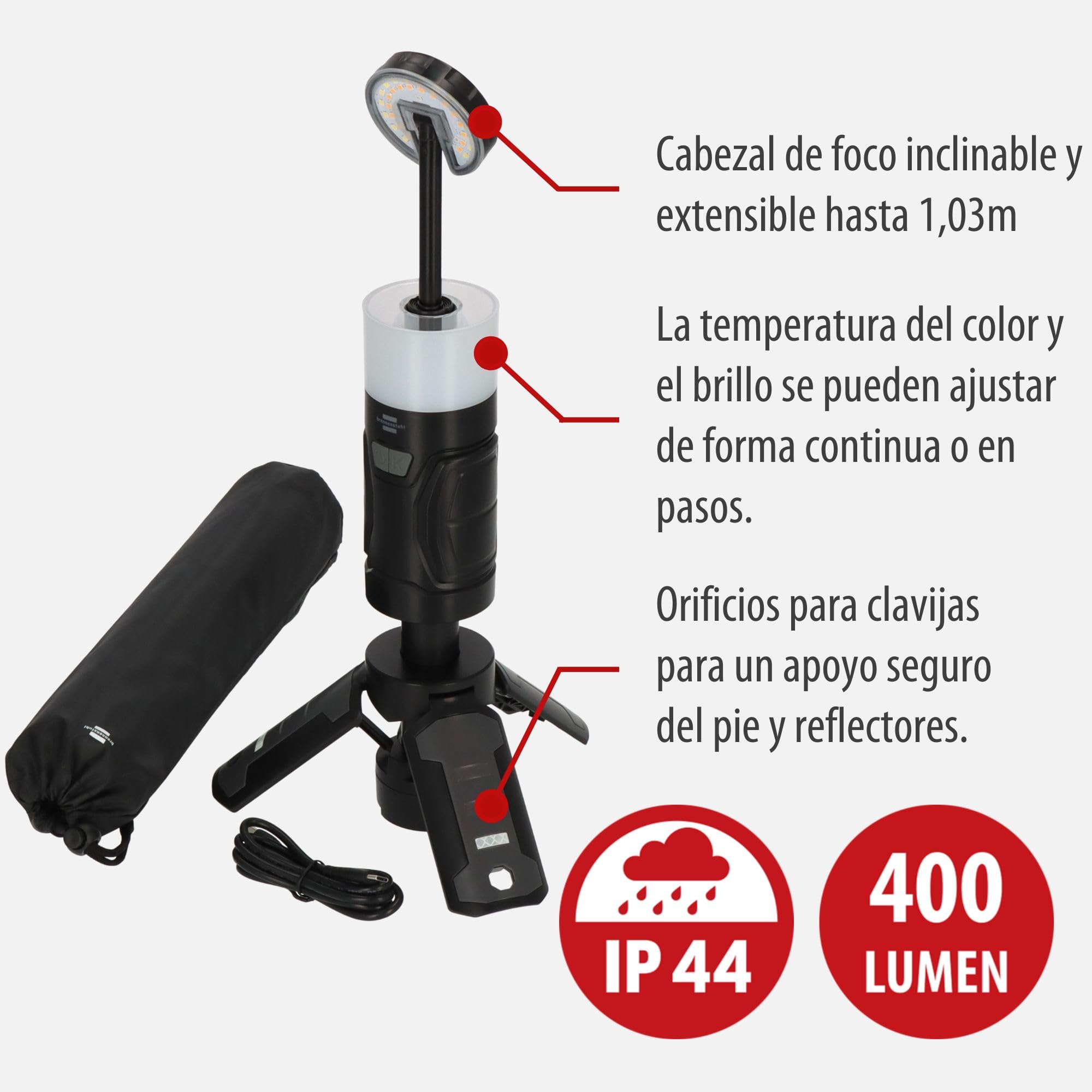 Conçue spécifiquement pour l’extérieur, la Brennenstuhl UL400AT bénéficie d’un indice de protection IP44, garantissant la protection contre les éclaboussures d’eau et les corps solides supérieurs à 1 mm. Son boîtier robuste en plastique ABS, léger et résistant, tolère parfaitement les chocs et l’humidité. Son format compact facilite son transport et son installation sur un trépied ou un support grâce à son crochet intégré, ce qui optimise le confort d’utilisation.