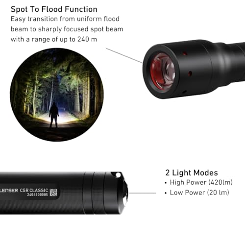 Grâce à son système de focalisation avancé, la Ledlenser C5R Classic permet un passage instantané de l’éclairage large pour éclairer une surface étendue à un faisceau concentré pour une vision longue distance ❇. Ce mécanisme s’actionne facilement par une bague rotative. Il garantit un confort d’utilisation exceptionnel, permettant d’adapter rapidement le faisceau lumineux selon les besoins, sans perte de puissance significative.