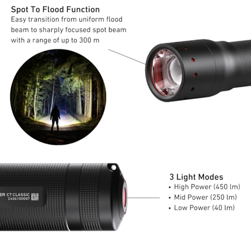 Grâce au système breveté Advanced Focus, l’utilisateur de la C7 Classic peut ajuster parfaitement la concentration du faisceau. Cette technologie combine un réflecteur précis avec une lentille optique spécialement conçue, permettant une transition rapide et fluide entre l’éclairage large et le faisceau concentré. Cela rend la Ledlenser C7 Classic particulièrement polyvalente pour différents usages, des tâches détaillées aux repérages à distance.