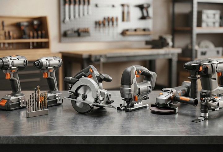 - Découpe et Meulage : Meuleuse angulaire à tête plate, scie sauteuse compacte et découpeur-ponceur polyvalent.