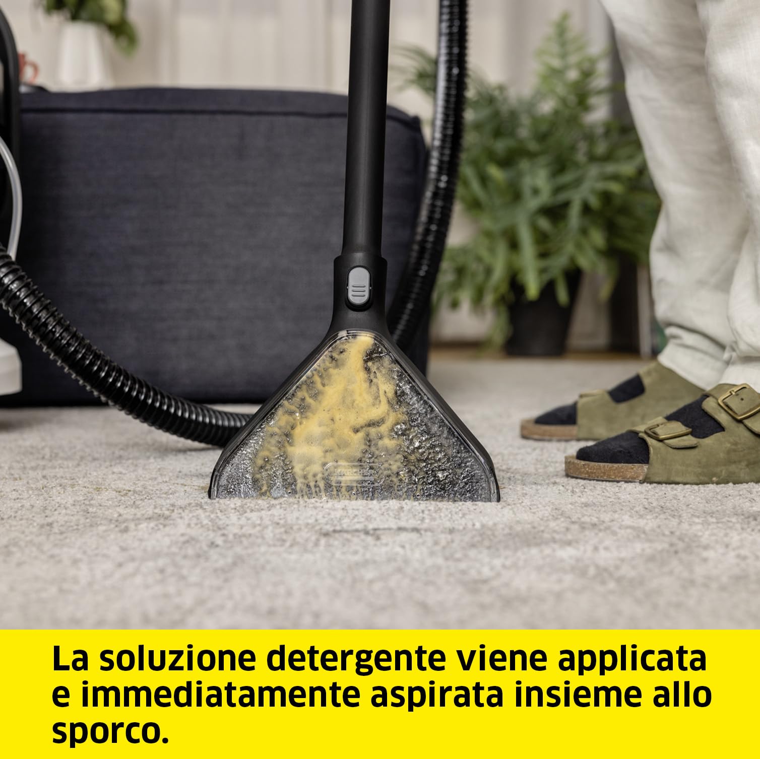 Conçu spécialement pour les tapis, le Kärcher SE 4 excelle aussi sur les sols durs grâce à ses accessoires adaptés. Le laveur aspirateur combine parfaitement lavage et aspiration, éliminant ★ les taches tenaces tout en respectant les surfaces fragiles. Son design adaptatif permet de passer sans effort des fibres textiles aux revêtements lisses, rendant son usage multifonctionnel et pratique pour toute la maison.