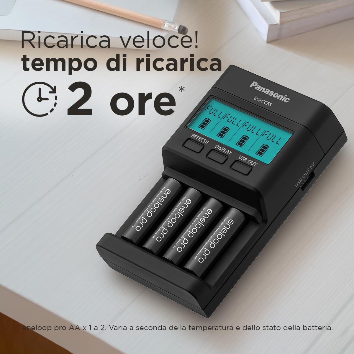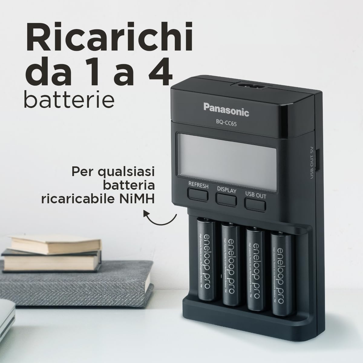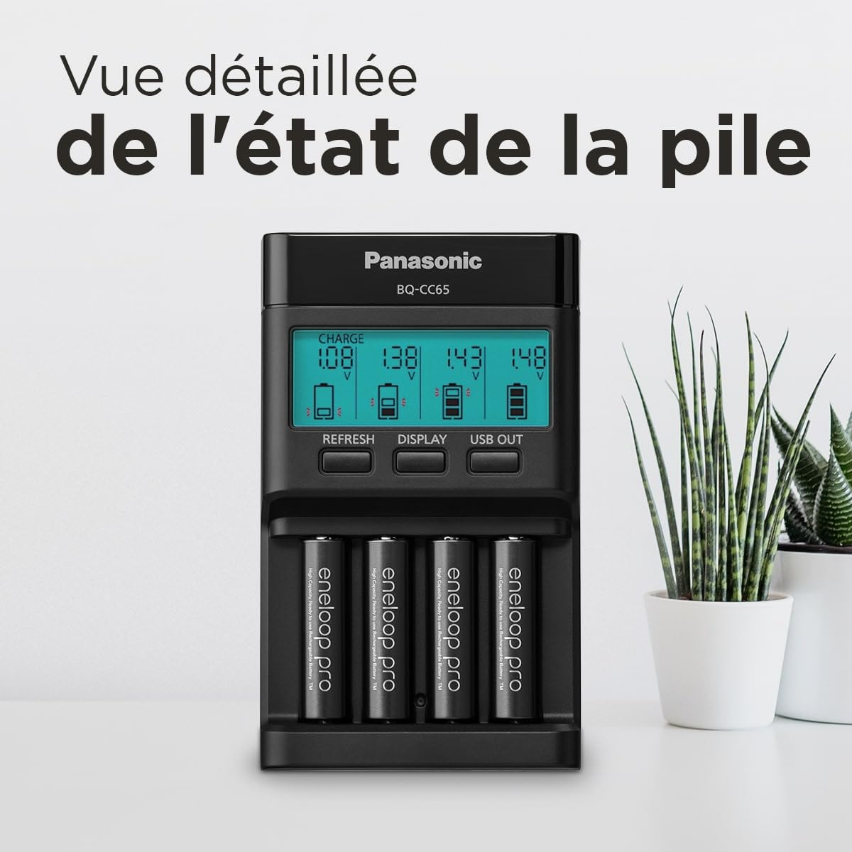Le Panasonic eneloop BQ-CC65E supporte la charge simultanée de 1 à 4 piles AA ou AAA.