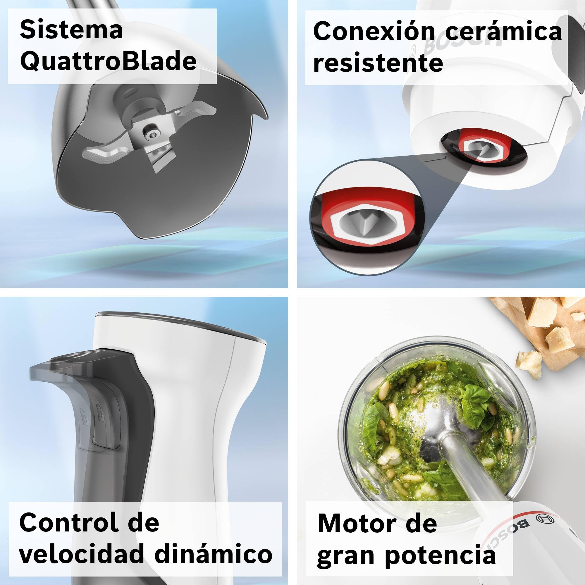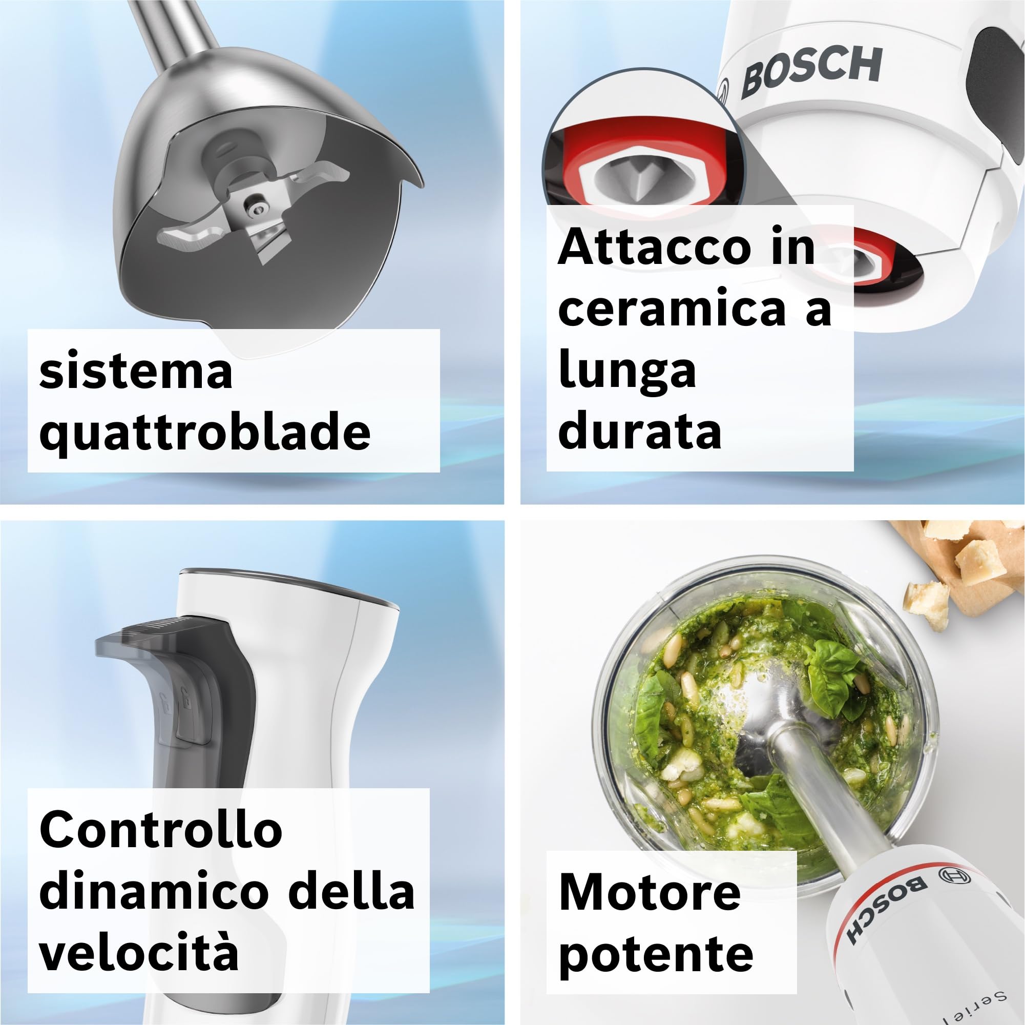 Sa conception ergonomique innovante assure une prise en main confortable, idéale pour un usage prolongé. Le manche est conçu pour réduire la fatigue grâce à un équilibre optimal du poids et une surface antidérapante qui empêche tout glissement accidentel. Avec le Bosch Stabmixer ErgoMaster MSM4W220 Serie 4, mixer devient un geste naturel et précis, parfaitement contrôlé même dans des récipients étroits ou profonds.