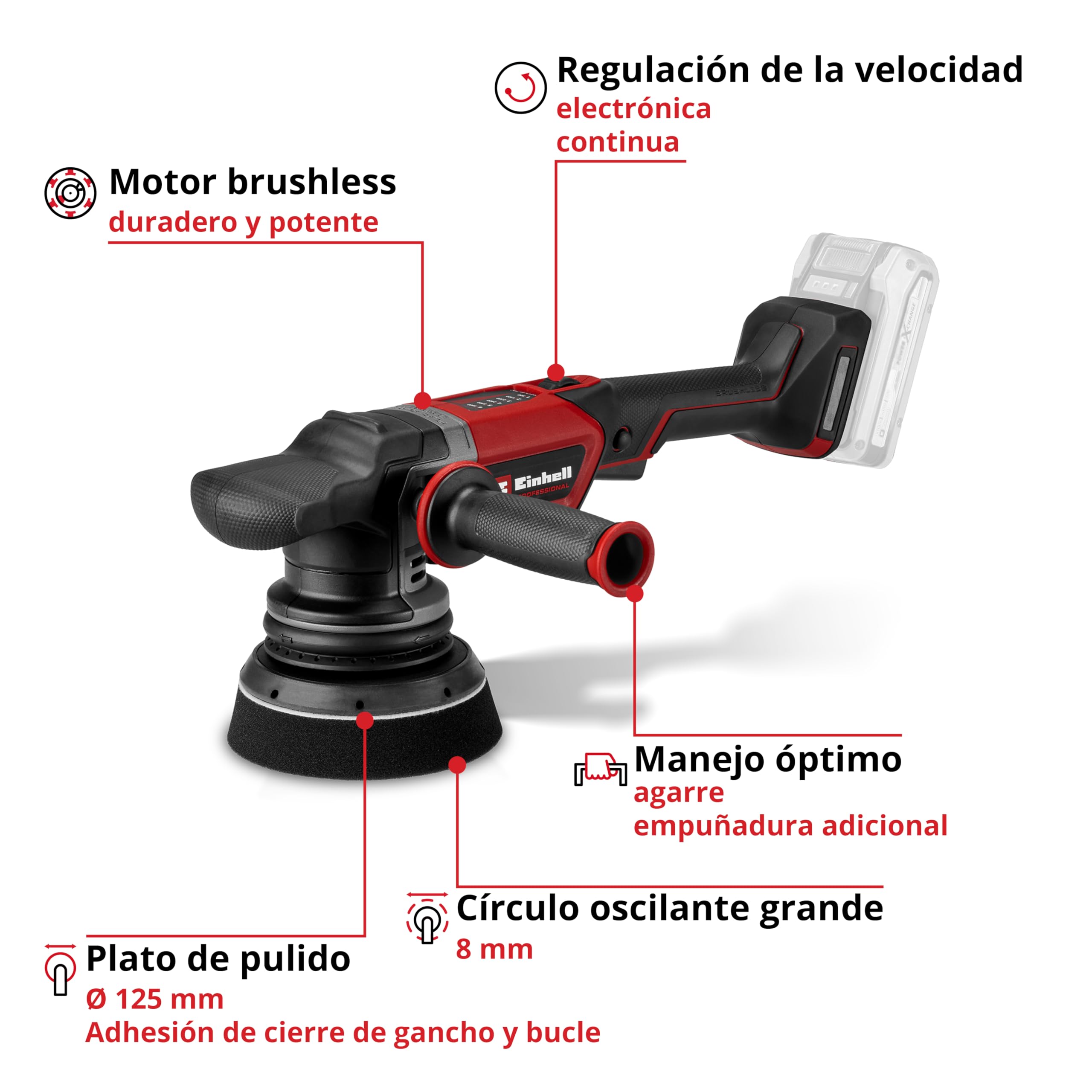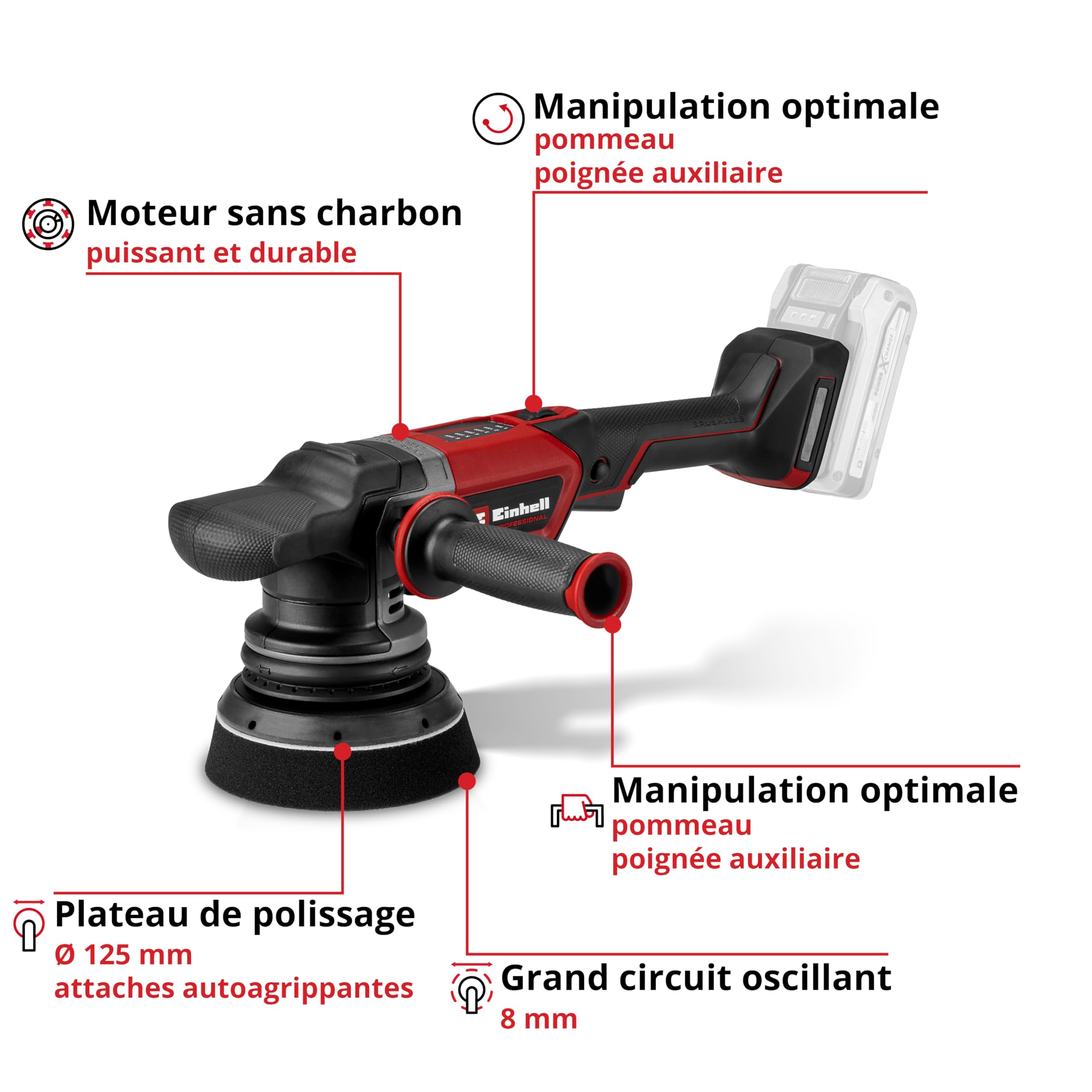 La particularité de l'Einhell Akku-Exzenterpolierer CP-EP 18/125 Li BL-Solo réside dans son mouvement excentrique. Cette oscillation combinée à une rotation aléatoire de la tête de polissage évite la formation d'hologrammes et de marques circulaires, souvent visibles avec les polisseuses rotatives classiques.