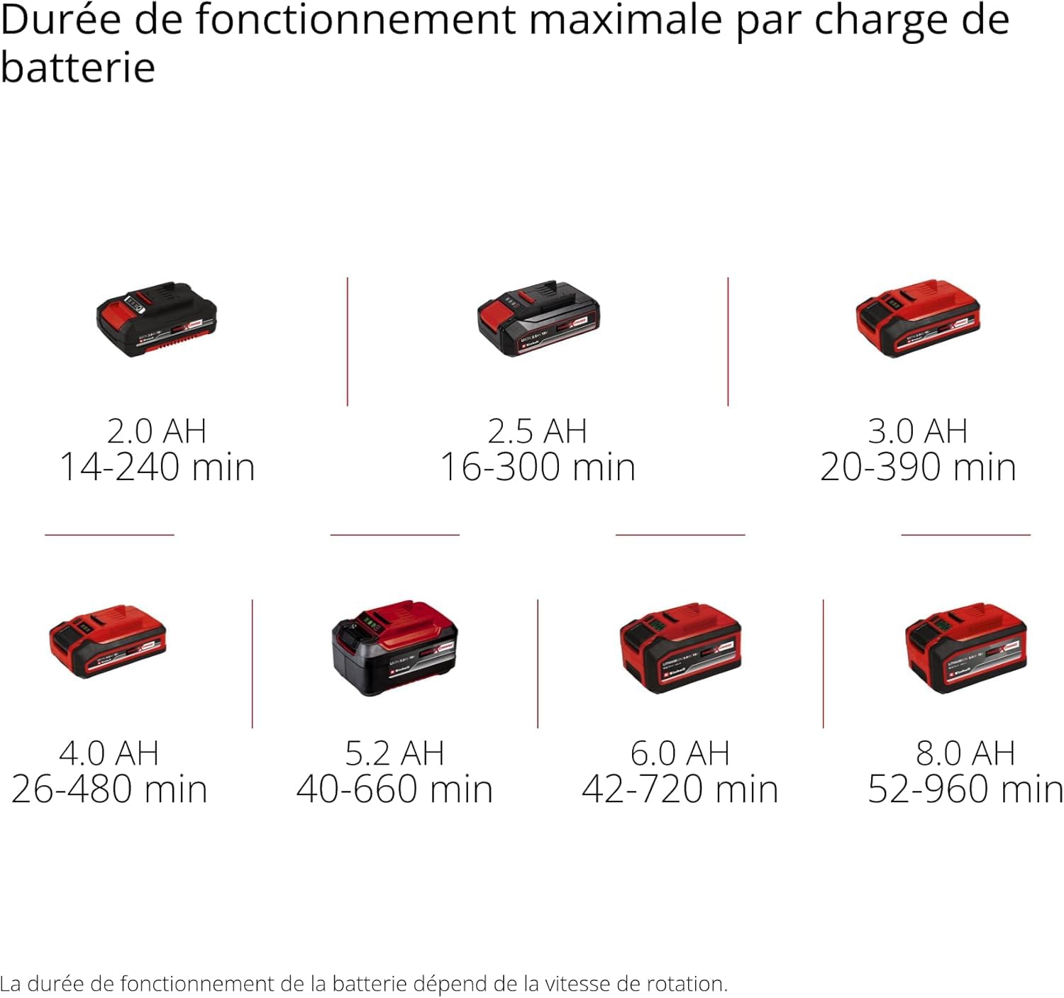 La batterie rechargeable intégrée se remplace facilement grâce au système Einhell Power X-Change, compatible avec un large choix d’outils de la marque, ce qui simplifie l’ensemble de l’équipement du jardinier.
