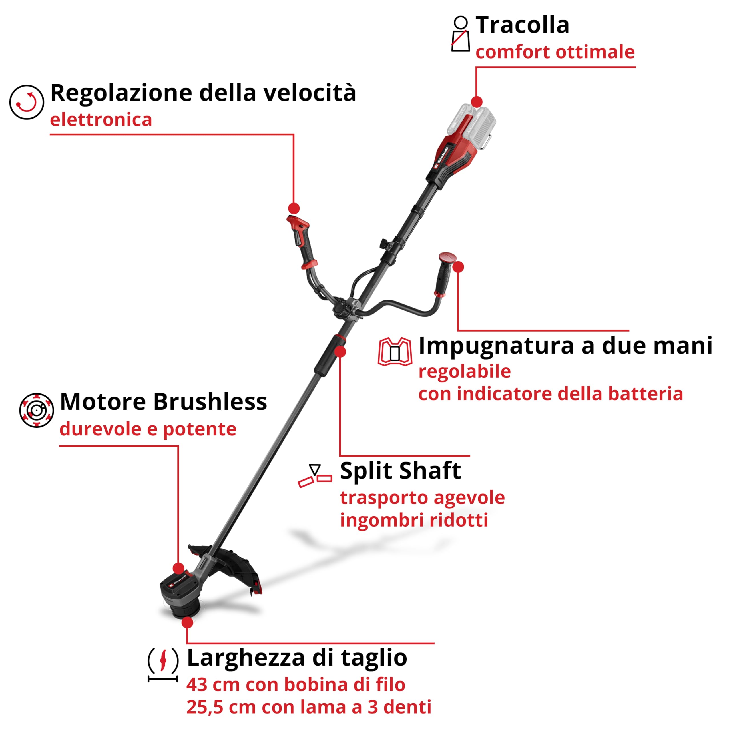 Débroussailleuse sans fil sur batterie 36V - largeur de coupe avec fil 430 mm - Einhell GP-BC 36/430 Li BL-Solo (vendue sans batterie ni chargeur),Dotée de la technologie Twin-Pack 36 V, la débroussailleuse sans fil GP-BC 36/430 Li BL-Solo Professional Einhell est un outil Power X-Change performant pour venir à bout des buissons et autres broussailles. L’appareil est entraîné par un moteur sans charbon Einhell pour plus de puissance et une utilisation prolongée. Le moteur est garanti 10 ans après son enregistrement en ligne. Comprend un dispositif de blocage de l’arbre, une bobine double fil à avance automatique interchangeable et une lame à 3 dents. Le variateur de vitesse et le témoin de charge de la batterie sont intégrés au niveau de la double poignée ajustable. Le manche séparable et le support mural facilitent le rangement de l’outil. Batterie et chargeur non inclus.,Fait partie de la gamme Power X-Change, fonctionne avec 2 batteries 18 V,Moteur Brushless – Plus de puissance et durée de fonctionnement prolongée,Moteur Brushless – Moteur garanti 10 ans après enregistrement,Technologie TWIN-PACK : 2 batteries 18 V Power X-Change – plus de puissance,Double poignée ajustable (forme guidon),Variateur électronique à 2 positions réglable directement sur la poignée,Manche séparable facilitant le transport,Témoin de charge de la batterie au niveau de la poignée en forme de guidon,Support mural intégré pour un rangement peu encombrant,Dispositif de blocage de l’arbre facilitant le changement d’accessoire de coupe