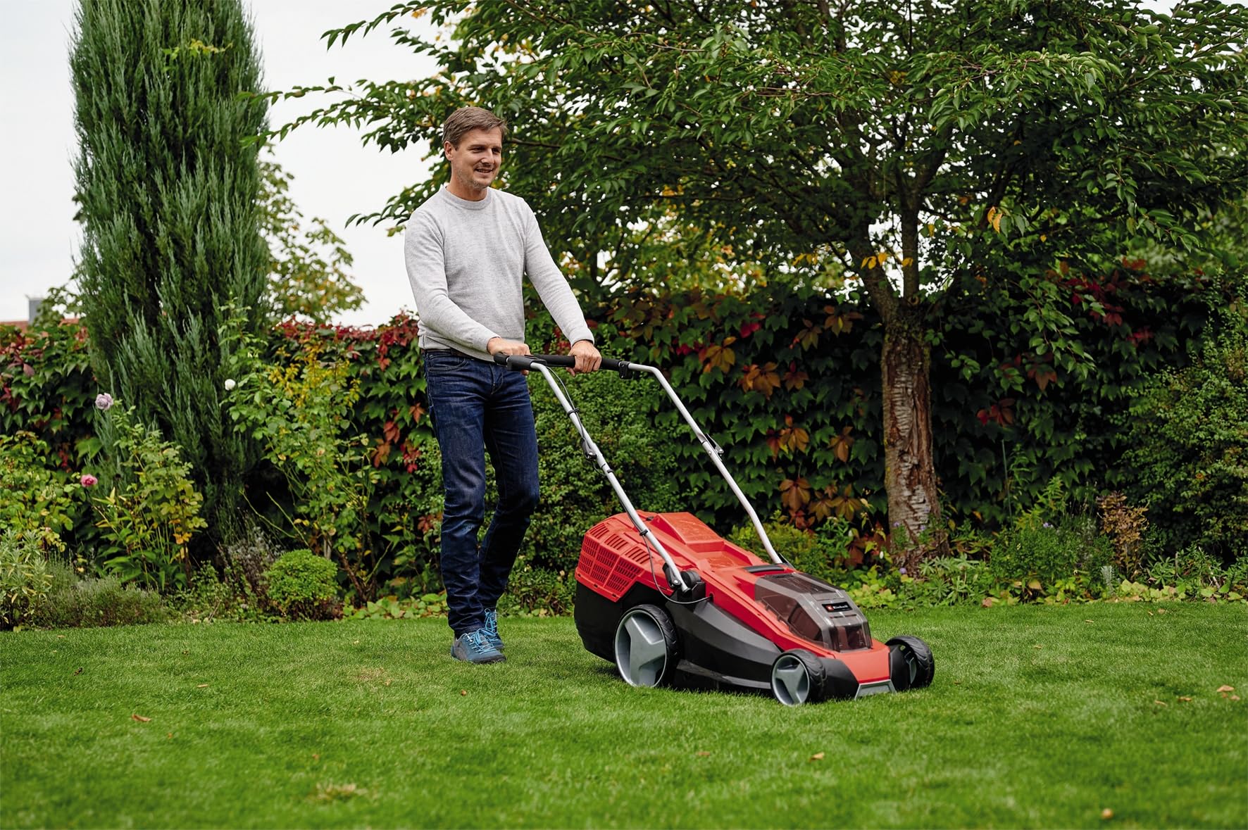 Le design compact et léger assure une prise en main confortable. Son poids réduit favorise le maniement sans effort, même lors de longues sessions. Le guidon réglable en hauteur selon trois positions garantit une posture adaptée à chaque utilisateur, minimisant la fatigue. Le bac de ramassage rigide de 50 litres optimise le stockage de l’herbe coupée sans interruption.