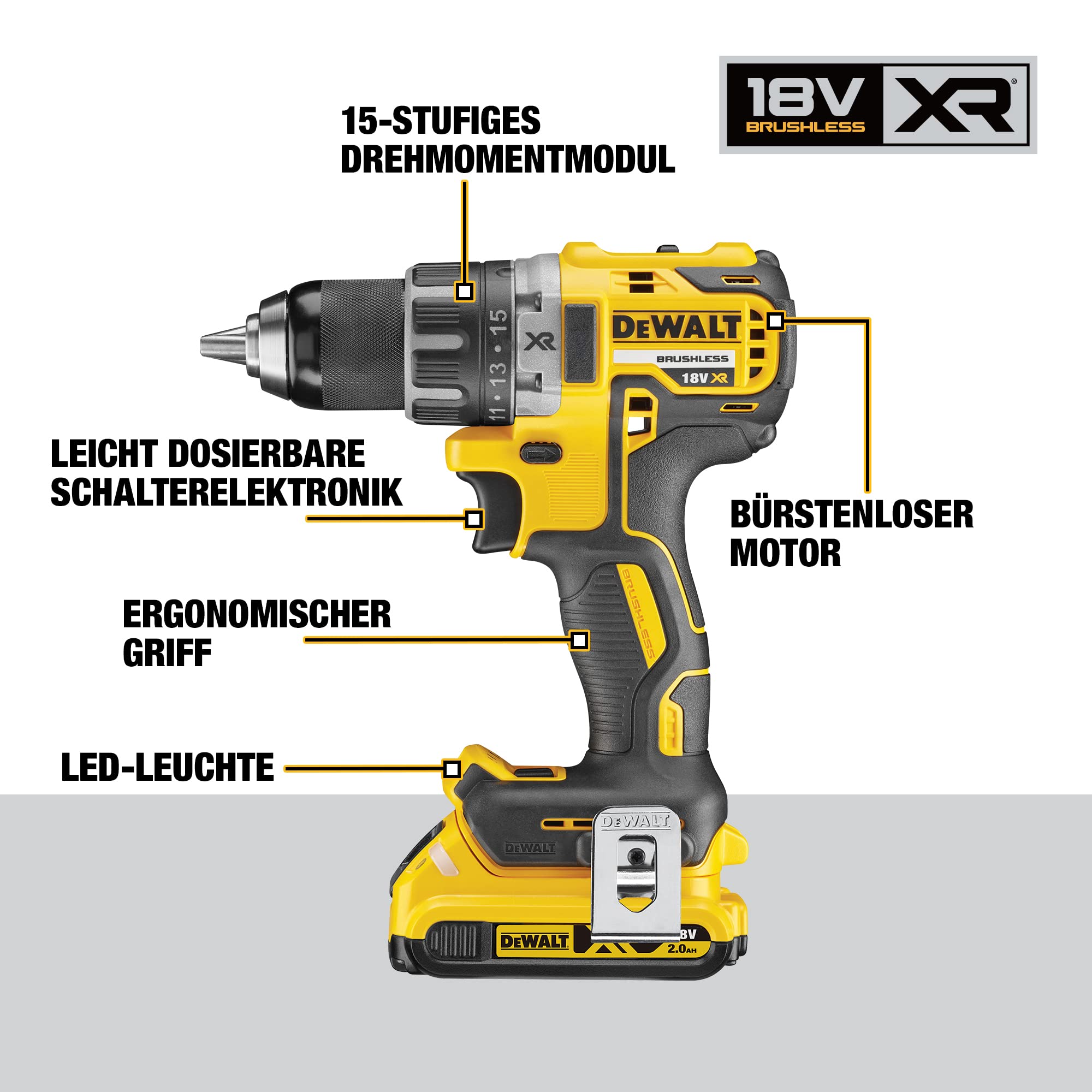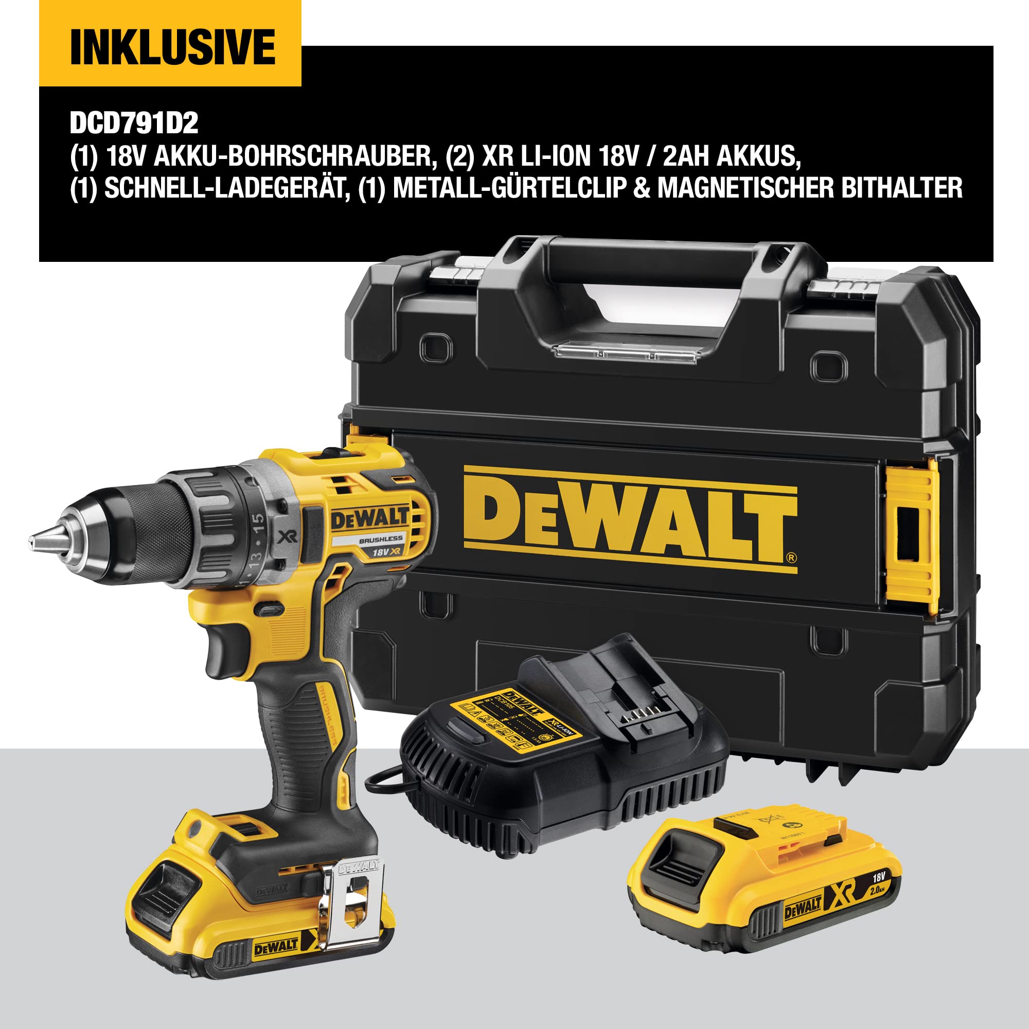 - Pack avec 2 batteries XR 18V Li-Ion 2Ah, chargeur, coffret TSTAK, porte-embout magnétique et clip ceinture -