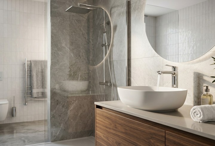 - Robinetterie : mitigeurs thermostatiques et colonnes de douche pour une gestion précise de l'eau.