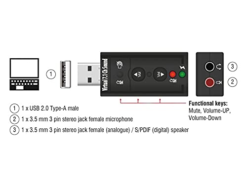 - Connecteurs : 1 x USB 2.0 type A mâle, 1 fiche jack 3,5 mm à 3 broches pour microphone, 1 x fiche jack 3,5 mm à 3 broches (analogique) / haut-parleur S/PDIF (numérique)