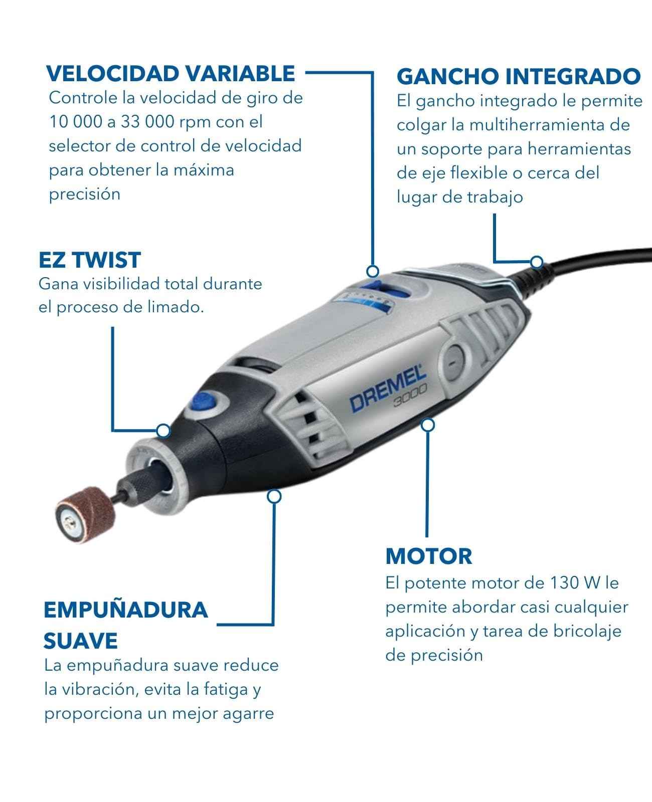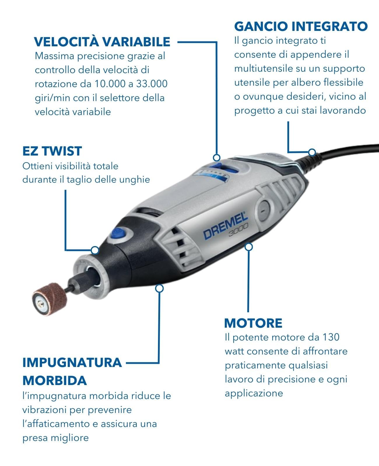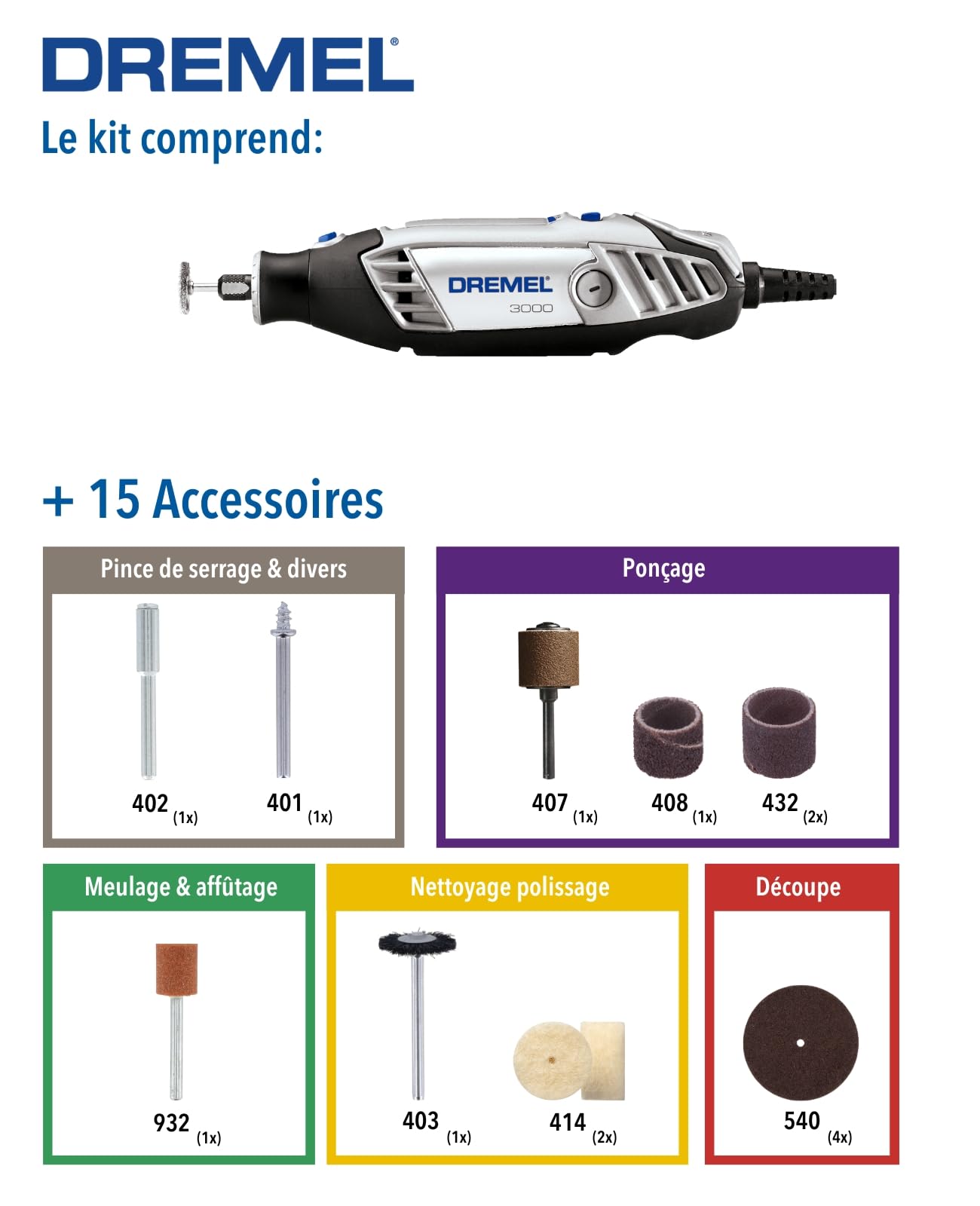 Cet outil multifonction est livré avec de nombreux accessoires qui en font un véritable allié pour de multiples tâches : mini ponceuse électrique, graveur, mini perceuse, meuleuse de poche, polisseuse de finition, et bien plus encore. Le contenu du coffret comprend l'outil Dremel 3000, un sac de rangement en tissu, 15 accessoires d'origine Dremel dans une boite en plastique, un manuel d'utilisation en français et une fiche des accessoires.