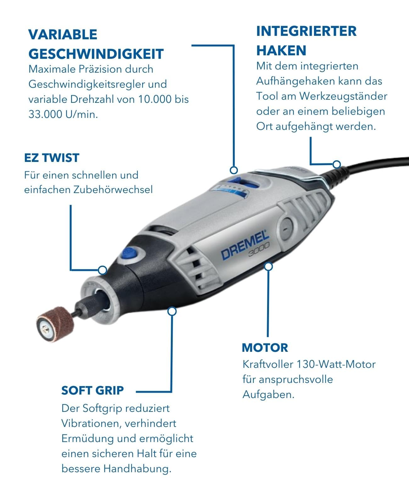 Le Dremel 3000-15 est un outil multifonction polyvalent de la marque Dremel. Avec une vitesse de rotation variable allant de 10.000 à 33.000 tr/min, cet outil vous permet d'adapter facilement votre vitesse en fonction du matériau que vous travaillez. La molette de réglage offre 5 positions différentes pour plus de précision.
