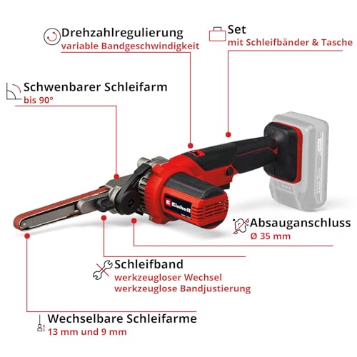 Lime électrique Einhell TE-BF 18 LI-SOLO,,La lime à bande sans fil TE-BF 18 Li-Solo Einhell est un outil pratique et maniable pour poncer et ébavurer des zones difficiles d’accès. Au sein de la gamme Power X-Change, cette lime à bande est compatible avec tous les chargeurs et batteries.,Elle est vendue avec deux bras de ponçage interchangeables de largeur différente. Le bras fin de 9 mm est parfaitement adapté aux zones étroites et au ponçage de pièces petites et délicates.,Le bras de 13 mm permet quant à lui de meuler également des surfaces planes de plus grande dimension. Le bras de ponçage pivote jusqu’à 90° pour travailler en toute flexibilité dans diverses positions et atteindre des zones peu accessibles.,Le variateur électronique permet de régler la vitesse de la bande entre 250 et 1 700 m/min en fonction du matériau et de l’enlèvement de matière souhaité, la lime se prêtant ainsi à des applications très diverses.,Pour les utilisations prolongées, cette lime à bande sans fil pratique et légère est dotée d’une fonction de blocage pour marche continue. La bande abrasive se change sans outil au moyen d’un levier, sa course s’ajustant à l’aide d’une vis située sur le bras de ponçage Avec sa forme ergonomique à surfaces Softgrip, la lime à bande tient confortablement en main.,Le carter moteur robuste est également pourvu d’un revêtement Softgrip et peut servir de poignée auxiliaire pour une manipulation optimale.,Le carter du bras de ponçage est en métal massif.,Pour une utilisation propre, un adaptateur permettant par exemple le branchement d’un aspirateur eaux et poussières Einhell est inclus de série.,L’outil est vendu avec un kit de 12 bandes abrasives de deux largeurs (longueur 457 mm, 2 de chaque dans les trois granularités P60, P80 et P120), deux bras de ponçage et un sac de transport et de rangement très pratique.,La batterie et le chargeur ne sont pas inclus. Ces accessoires sont disponibles séparément.