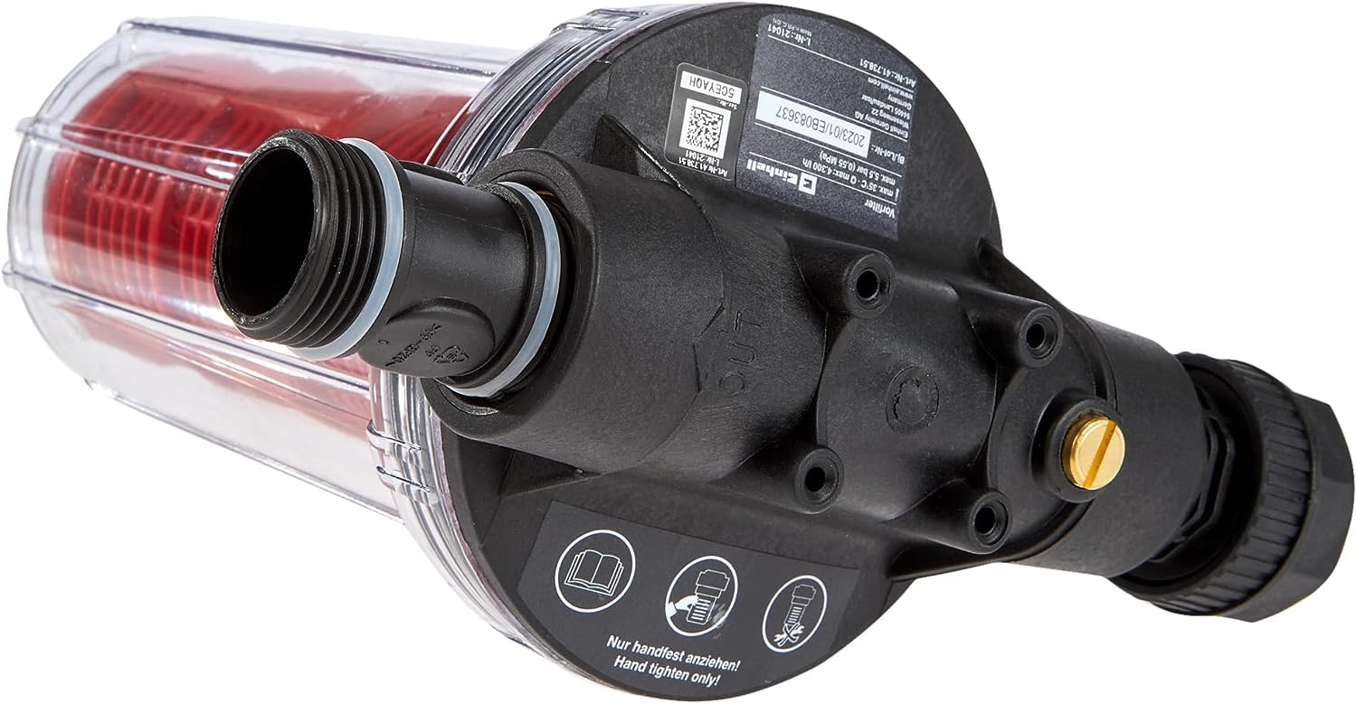 La conception intelligente de l'Einhell Pumpen-Vorfilter 4173851 inclut un boîtier entièrement transparent. Cette caractéristique capitale permet une surveillance visuelle instantanée de l'état du filtre. Vous pouvez ainsi évaluer d'un simple coup d'œil le niveau d'encrassement de la cartouche, sans qu'il soit nécessaire de démonter l'appareil. Cette facilité d'inspection proactive garantit que vous pouvez intervenir rapidement pour le nettoyage, évitant toute baisse de performance due à un filtre saturé et maintenant une efficacité optimale de votre système de pompage.
