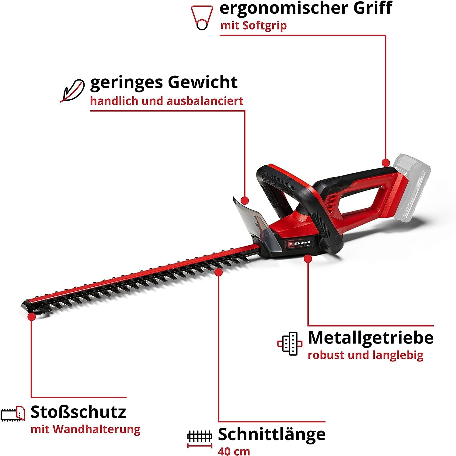 Taille-haie sans fil sur batterie 18V Einhell GC-CH 18/40 Li-Solo (vendu sans batterie ni chargeur),Le taille-haie sans fil GC-CH 18/40 Li-Solo Einhell allie puissance et flexibilité : ce taille-haie de la gamme Power X-Change Einhell est entraîné par une puissante batterie lithium-ion. Petit et maniable, ce véritable « poids plume » permet une manipulation confortable. L’engrenage métallique robuste est conçu pour être très durable, et transmet parfaitement la puissance délivrée par la batterie à la lame en acier découpée au laser et affûtée au diamant. Un interrupteur de sécurité à 2 mains protège l’utilisateur pendant le fonctionnement. Sont inclus de série un protège-lame en aluminium, une protection anti-chocs avec support mural et un fourreau solide pour le transport et le rangement de l’outil. Les batteries haute performance Power X-Change se combinent à l’infini avec tous les appareils de cette même gamme. Le taille-haie sans fil fonctionne avec une batterie 18 V. L’outil est vendu sans batterie ni chargeur, ces accessoires étant disponibles séparément en plusieurs puissances, notamment dans le Starter Kit, très pratique.,Fait partie de la gamme Power X-Change, fonctionne avec 1 batterie 18 V,Petit et maniable,Poids réduit pour une utilisation confortable,Lame en acier découpée au laser et affûtée au diamant,Engrenage métallique pour une longue durée de vie,Interrupteur de sécurité à 2 mains,Protège-lame en aluminium,Protection anti-chocs avec support mural,Fourreau de protection solide pour le rangement et le transport,Outil vendu sans batteries ni chargeur (disponibles séparément),Longueur de coupe : 40 mm,Longueur du guide chaîne : 47,5 cm,Code livraison : SSLW