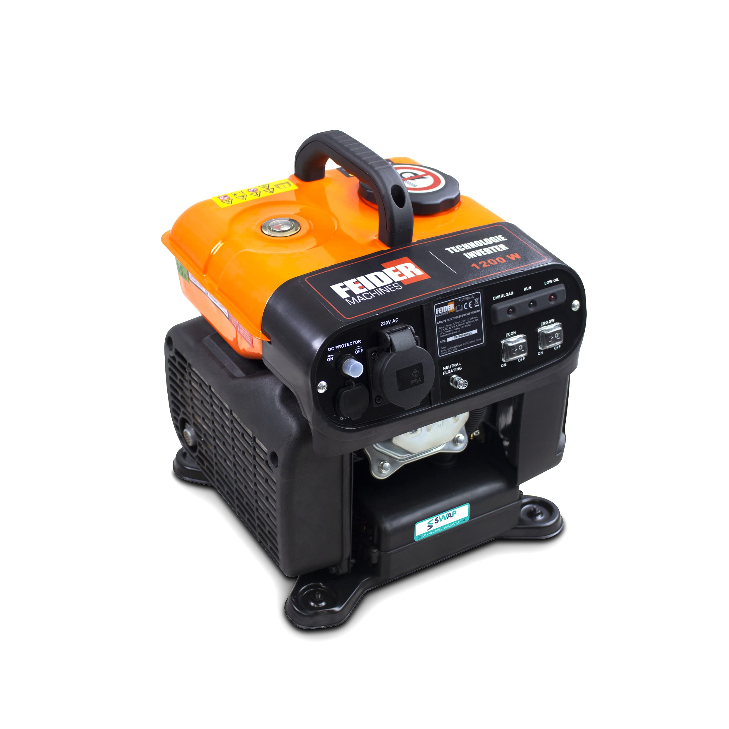 ["Idéal pour un usage extérieur et remarquable pour sa polyvalence : le groupe électrogène essence Inverter FG1600i-AIndispensable pour les travaux ou loisirs extérieurs, pour sécuriser un système électrique ou pour produire de l'électricité dans un endroit isolé, le groupe électrogène FG1600i-A est apprécié pour ses caractéristiques remarquables et sa polyvalence.Son moteur thermique 4T délivre une puissance de 1200 Watts maximum et vous accompagne sans effort dans tous vos déplacements, grâce à sa solide poignée de transport.Idéal pour vos appareils électroniques sensibles comme les téléphones, les appareils photos, les tablettes, le camping et les applications domestiques, les petits outils électriques,Le FG1600i-A est en plus doté de la technologie haut de gamme Inverter.Le système Inverter permet de restituer un courant électrique stable et de faire fonctionner sans risque les appareils les plus exigeants, électriques ou électroniques.Vous pouvez recharger vos batteries (de smartphones, tablettes...) et faites fonctionner tout appareil électroménager quand vous partez en vacances en camping-car ou sous la tente en toute sécurité.Le réservoir de carburant de ce groupe à essence possède une capacité de 4500 mL soit une autonomie de 5.5 heuresLe FG1600i-A Feider peut également servir de source électrique pour alimentation de secours transportable.Garantie de 2 ans, assurée par le réseau SWAP-Europe :Pour le SAV, vous pouvez contacter l'un des 400 points en France qui se chargera de la réparation de votre article pendant la période de garantie.SWAP c'est un stock très important de pièces détachées : l'envoi est assuré en 72 heures.SWAP conserve en stock pendant 5 ans les pièces détachées, même après l", None]