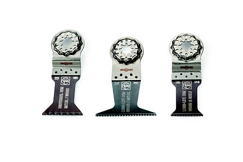 Lame de scie plongeante pour multifonction multi Fein E-cut Starlock bois et métal, 3 pièces,Combo E-Cut Starlock BOIS & METAL. 3 lames de scie plongeantes E-Cut pour les travaux de sciage dans le bois et le métal. Conviennent pour tous les MultiTools FEIN ainsi que pour tous les autres MultiTools courants avec porte-outil Starlock. Prix intéressant en set par rapport au prix à l’unité. Contenu : 2 lames de scie E-Cut Long-Life (50 x 35 mm, 50 x 65 mm), 1 lame de scie universelle E-Cut (55 x 44 mm).,lame de scie long life excellente durée de vie, qualité de coupe élevée et bonne vitesse de coupe. Largeur moyenne, forme taillée pour une vitesse de coupe optimale et une bonne évacuation des copeaux,lame de scie universelle E-Cut Bi-métal avec denture universelle avoyée. Large gamme d’utilisations pour tôles jusqu’à 2 mm, profilés en aluminium, tubes de cuivre, bois, plaques de plâtre et plastiques,Conviennent pour tous les MultiTools FEIN ainsi que pour tous les autres MultiTools courants avec porte-outil Starlock,Prix intéressant en set/combo par rapport au prix à l’unité,1 lame de scie E-Cut Long Life Bi-métal 50mm x 35mm avec denture bois alternée pour tous les matériaux dérivés du bois, les plaques de plâtre et le plastique. Extrêmement robuste, ne craint pas les clous incrustés dans le bois (jusqu’à Ø 4 mm), les résidus de maçonnerie, etc,1 lames de scie E-Cut Long Life Bi-métal 50mm x 65mm avec denture bois alternée pour tous les matériaux dérivés du bois, les plaques de plâtre et le plastique. Extrêmement robuste, ne craint pas les clous incrustés dans le bois (jusqu’à Ø 4 mm), les résidus de maçonnerie, etc,1 lame de scie universelle E-Cut Bi-métal 55mm x 44mm avec denture universelle avoyée. Large gamme d’utilisations pour tôles jusqu’à 2 mm, profilés en aluminium, tubes de cuivre, bois, plaques de plâtre et plastiques
