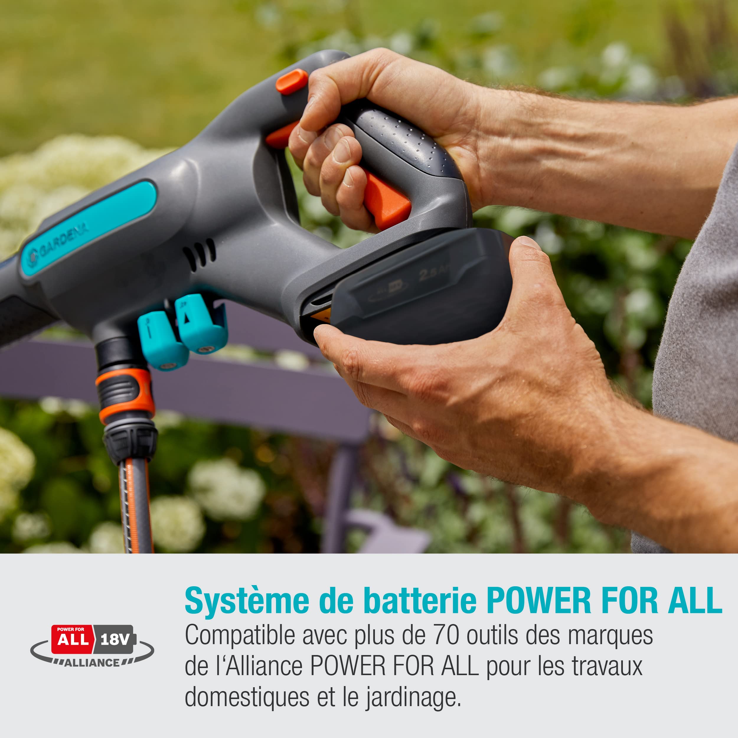 Le système de batterie performant POWER FOR ALL est multi-marques et compatible avec d'autres appareils pour la maison et le jardin, offrant de nombreuses possibilités d'utilisation. Le kit comprend le nettoyeur moyenne pression sans fil Gardena AquaClean 24/18V P4A solo, une buse à 0°, 15° et 40°, une lance longue et courte, un raccord OGS pour le tuyau d'arrosage, un tuyau d'aspiration de 5 m avec raccords OGS et filtre, un couvercle de protection de la batterie petit et grand, une batterie P4A PBA 18V/45 2.5 Ah, et un chargeur.
