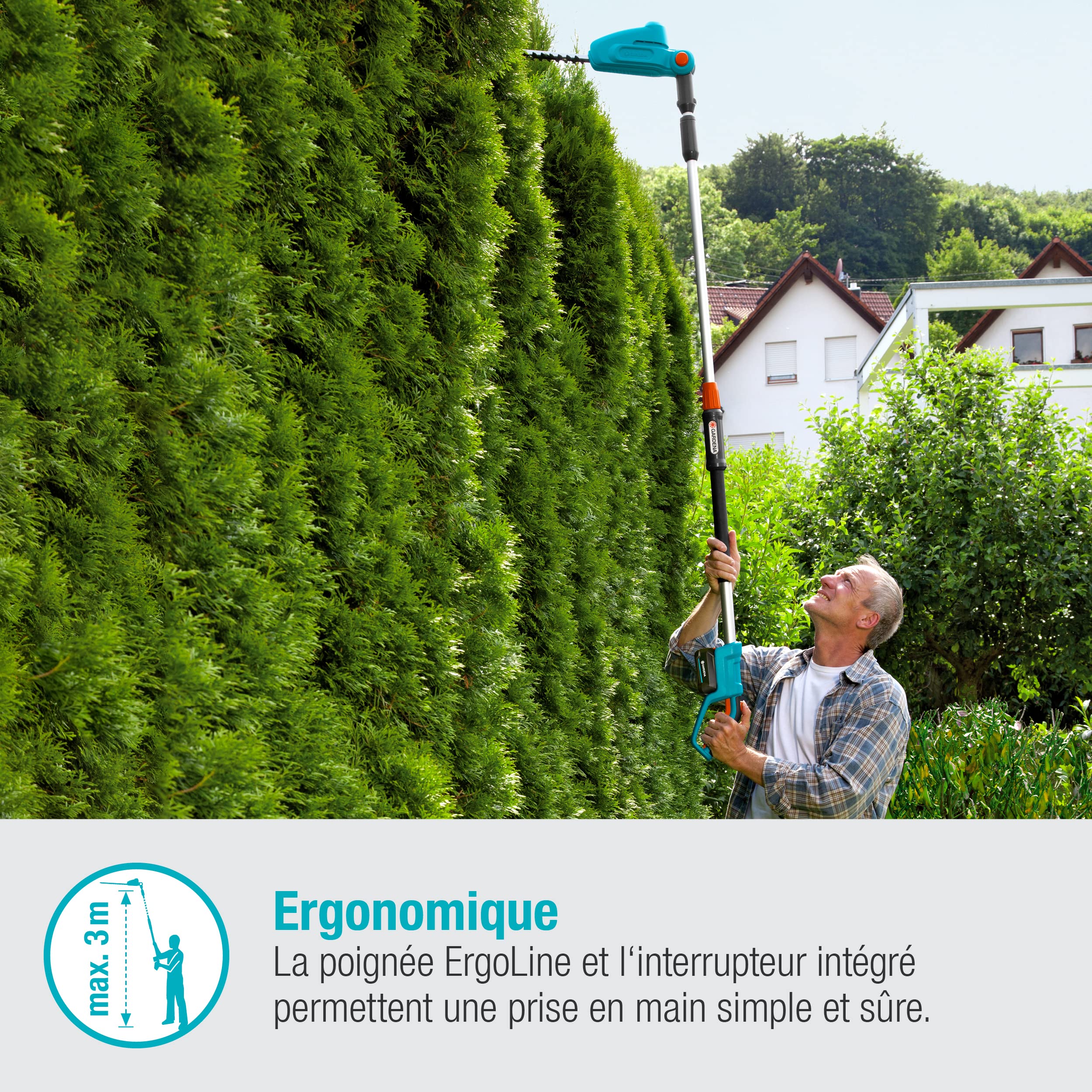 Pesant remarquablement peu pour sa catégorie, le GARDENA Taille-haies sur perche favorise un confort de travail prolongé. Son manche télescopique offre une portée d’environ 3 mètres, idéale pour atteindre le haut des haies sans avoir recours à une échelle. La légèreté combinée au balancement précis améliore le contrôle et réduit la fatigue lors des sessions de taille intensives, faisant de cet outil un allié indispensable pour un entretien facile et sécurisé de vos haies.