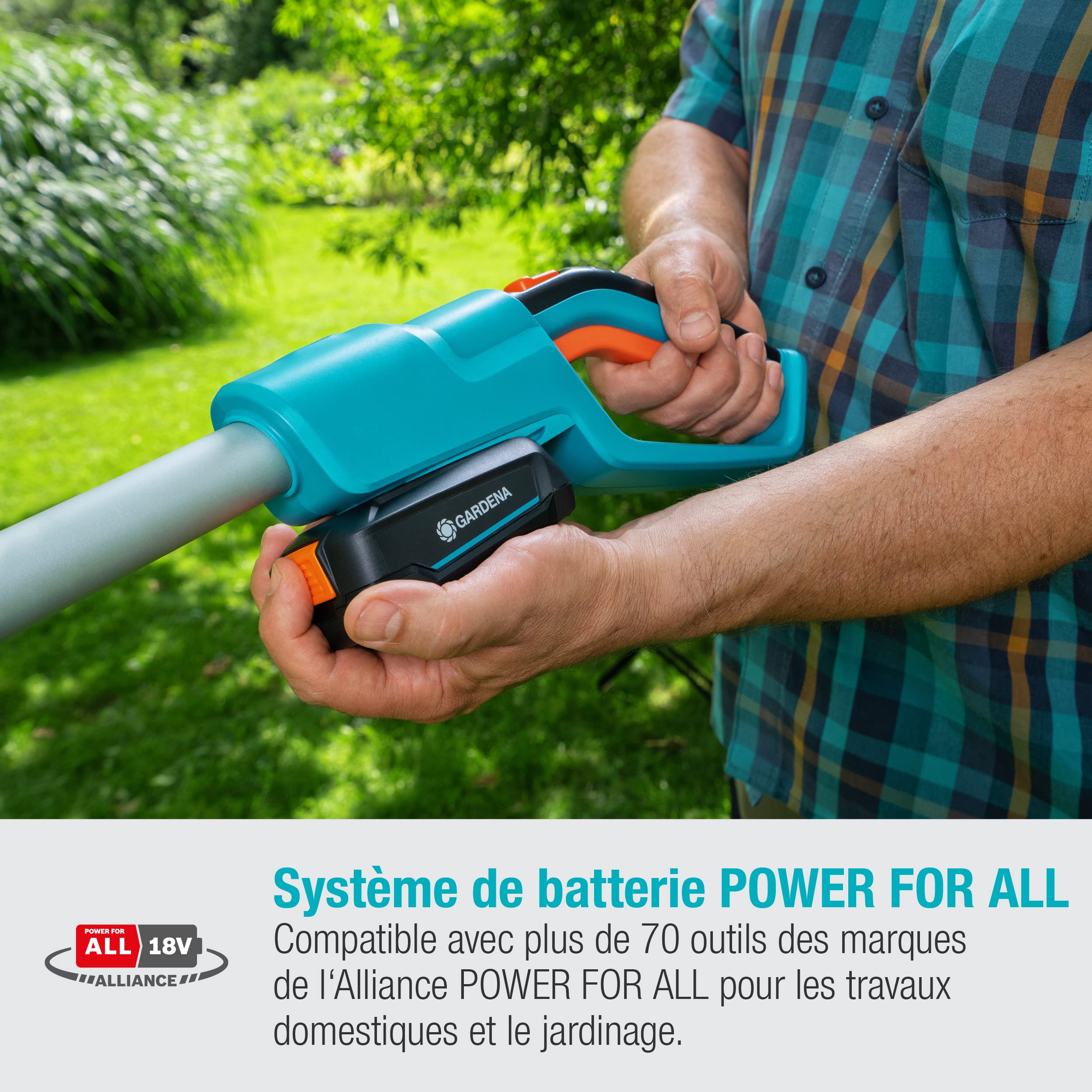 Le système POWER FOR ALL de GARDENA est compatible avec plus de 70 produits issus de 6 marques partenaires, couvrant plus de 100 applications. La batterie et le chargeur fournis sont interchangeables entre ces différents appareils, ce qui permet un gain économique et écologique majeur. Cette alliance offre une solution complète pour tous vos besoins de jardinage, avec un seul type de batterie et de chargeur, extrêmement pratique et modulable.