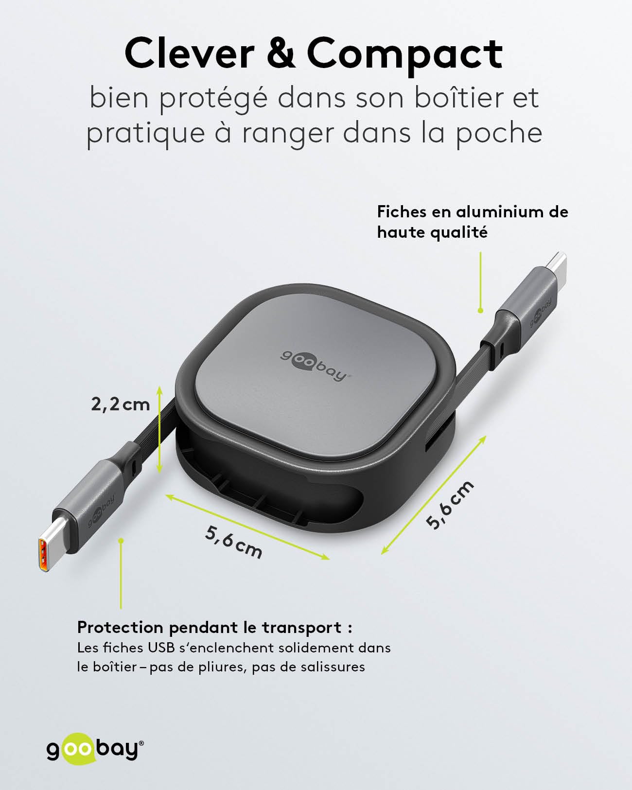 Ce câble intègre un mécanisme ingénieux de rétraction qui permet de ranger le cordon facilement, évitant les nœuds et les enchevêtrements. Son format compact et léger, avec une longueur rétractable jusqu’à 1,2 m, facilite le transport, que ce soit dans une poche ou un sac. Ainsi, le Goobay Cable USB 2.0 Type C s’adapte parfaitement à un environnement nomade, éliminant les désagréments classiques des câbles encombrants. Ce système rétractable ★ garantit un rangement soigné et rapide en toutes circonstances.