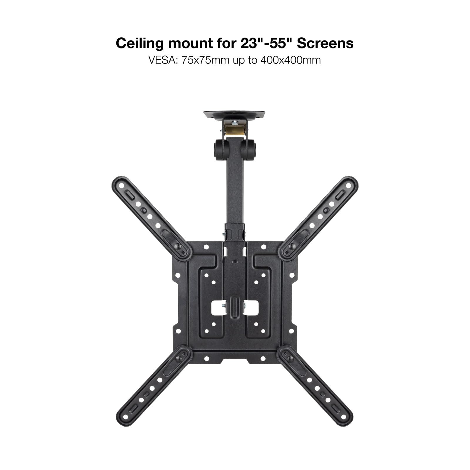 Le support de montage au plafond Tooq est conçu pour accueillir une large gamme d’écrans, allant de 23 pouces à 55 pouces. Cette compatibilité universelle répond parfaitement aux besoins variés, que ce soit pour un usage domestique ou professionnel. Grâce à ses dimensions ajustables, il s’adapte aisément aux différentes tailles et aux modèles les plus courants du marché. Cela permet une installation rapide et sécurisée, sans nécessité d’outils spécifiques ou de modifications structurelles lourdes.
