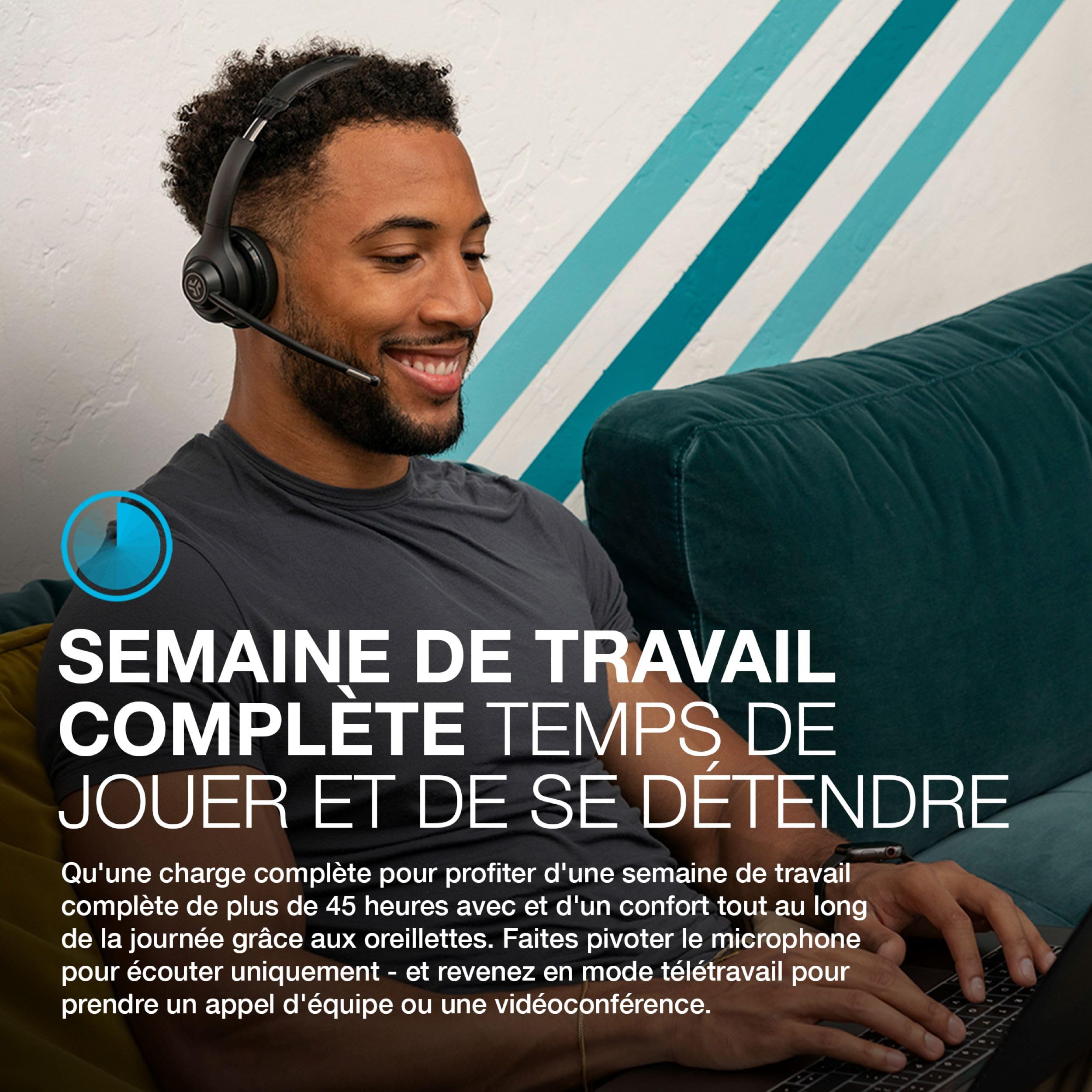L’arceau et les coussinets du JABRA Go Work Black sont conçus pour un port prolongé sans gêne ni pression excessive. Le casque est léger et dispose d’un micro à tige pivotant qui peut se ranger discrètement, à l’abri des chocs. Le design sobre et noir mat offre une esthétique professionnelle, parfaitement adaptée aux environnements de travail modernes, tout en garantissant un excellent maintien pour les longues sessions.