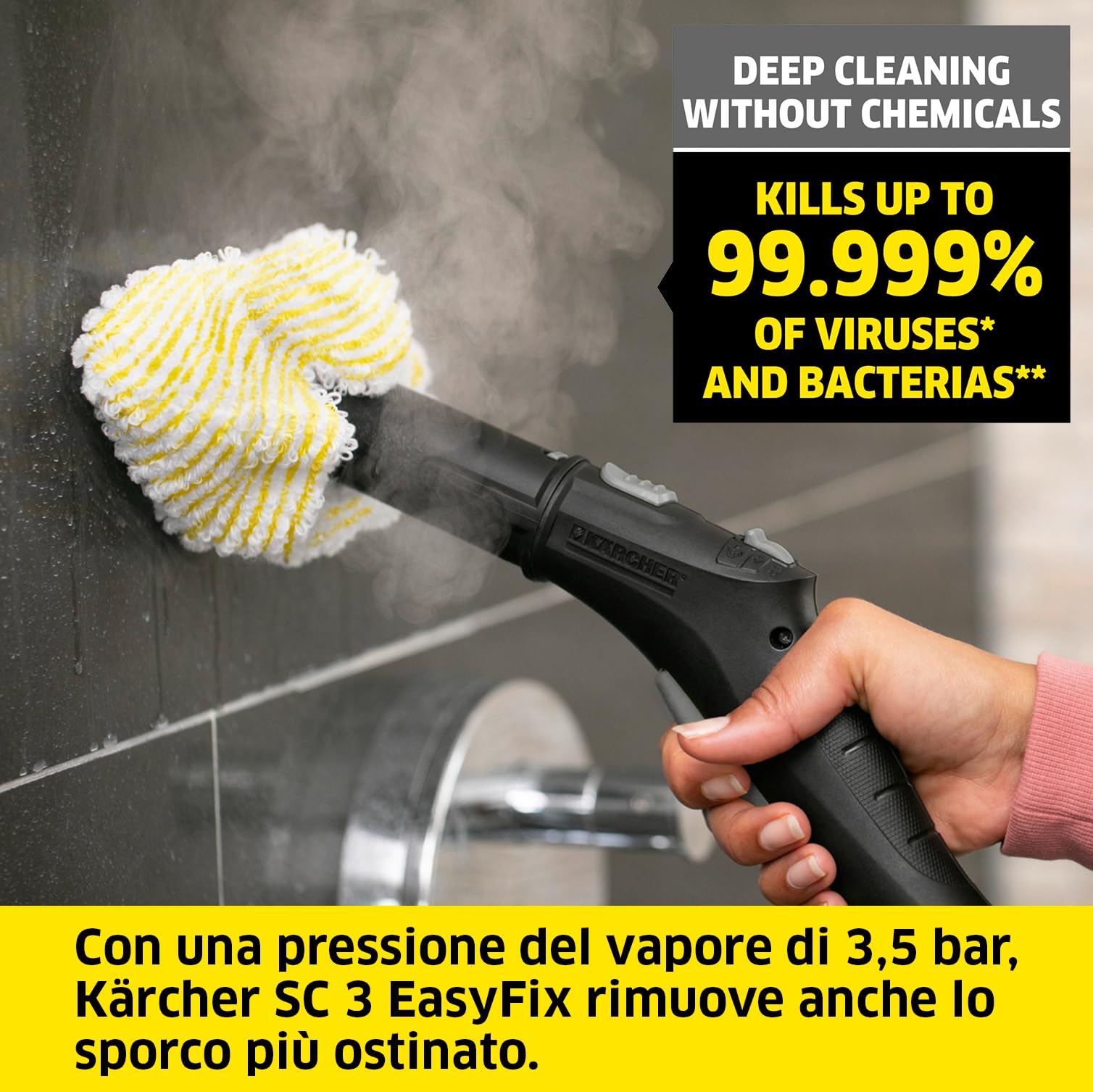 Le Kärcher Dampfreiniger SC 3 Easy Fixation délivre une puissance électrique de 1 900 Watts, garantissant une montée en température rapide et une vapeur abondante. Cette puissance permet au nettoyeur vapeur d’atteindre une pression optimale pour éliminer efficacement la saleté, les graisses tenaces et les bactéries, sans utiliser de produits chimiques. En seulement 30 secondes, l’appareil est prêt à l’emploi, ce qui fait gagner un temps précieux lors de vos sessions de nettoyage.