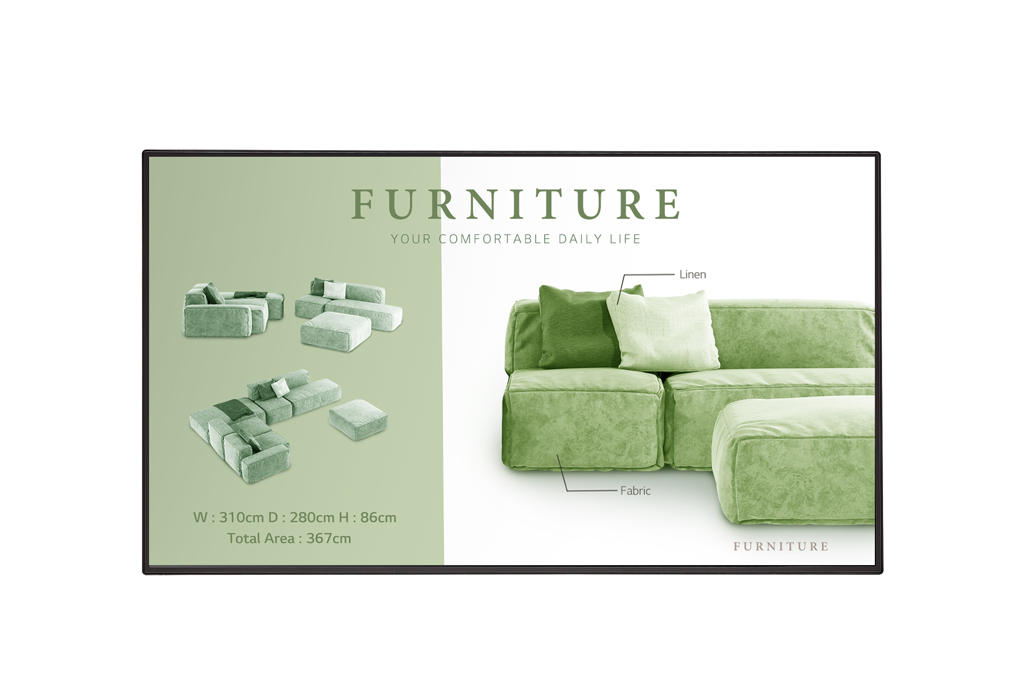 L'esthétique du LG LG 65UM5N-H est aussi impressionnante que ses performances. Son design élégant et épuré, avec des bords fins de seulement 9.9 mm sur les côtés supérieur, droit et gauche, et 12.4 mm sur le bord inférieur, garantit que votre contenu reste au centre de l'attention. Cette finesse du cadre permet également une intégration plus harmonieuse dans des installations multi-écrans. L'afficheur est compatible avec la norme de montage VESA 300 x 300 mm, offrant une grande flexibilité pour l'installation murale ou sur pied. Que ce soit en mode portrait ou paysage, le LG LG 65UM5N-H s'adapte à vos besoins spécifiques, offrant une solution d'affichage polyvalente et professionnelle qui complète l'esthétique de tout espace commercial. La robustesse de sa construction assure une durabilité accrue, même dans des environnements exigeants.