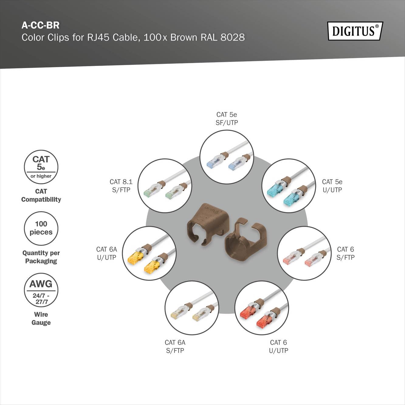 Nom du produit : DIGITUS DIGITUS Farbclips für Patchkabel 100Stk. Braun