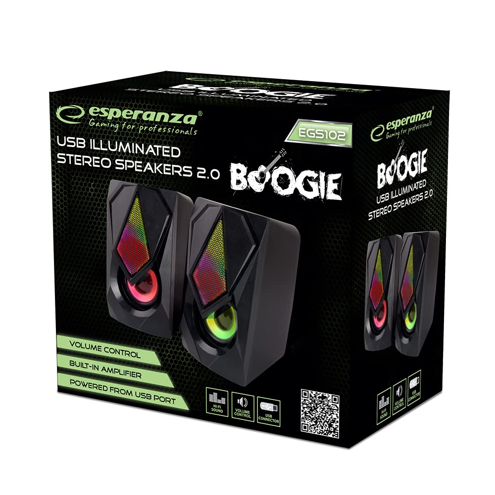 Les enceintes Esperanza EGS102 Rainbow Boogie sont faciles à installer et à utiliser. Branchez-les simplement à votre ordinateur, ordinateur portable ou autre appareil compatible via le port USB et profitez d'un son clair et équilibré. L'éclairage LED RGB réglable ajoute une touche de style et de dynamisme à votre espace de vie ou de travail.