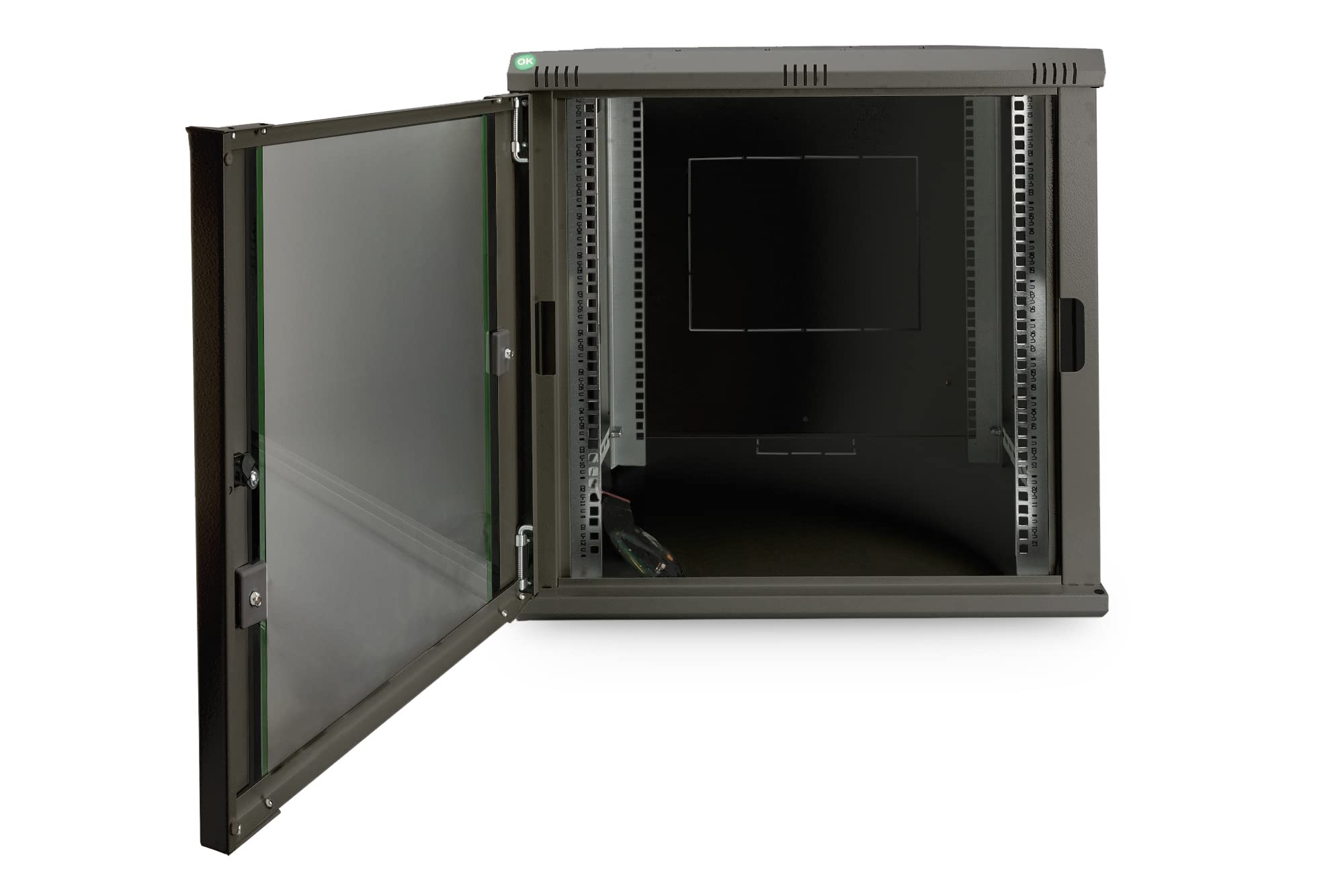 Ce boîtier mural supporte jusqu’à 12 U de hauteur, offrant une capacité suffisante pour monter divers équipements standards tels que serveurs, switches ou patch panels. L'intérieur est pensé pour faciliter l’organisation, avec des rails harmonieusement positionnés aux normes 19 pouces. La profondeur standard de 600 mm permet d’accueillir la grande majorité des composants IT, garantissant un montage simple et ergonomique.