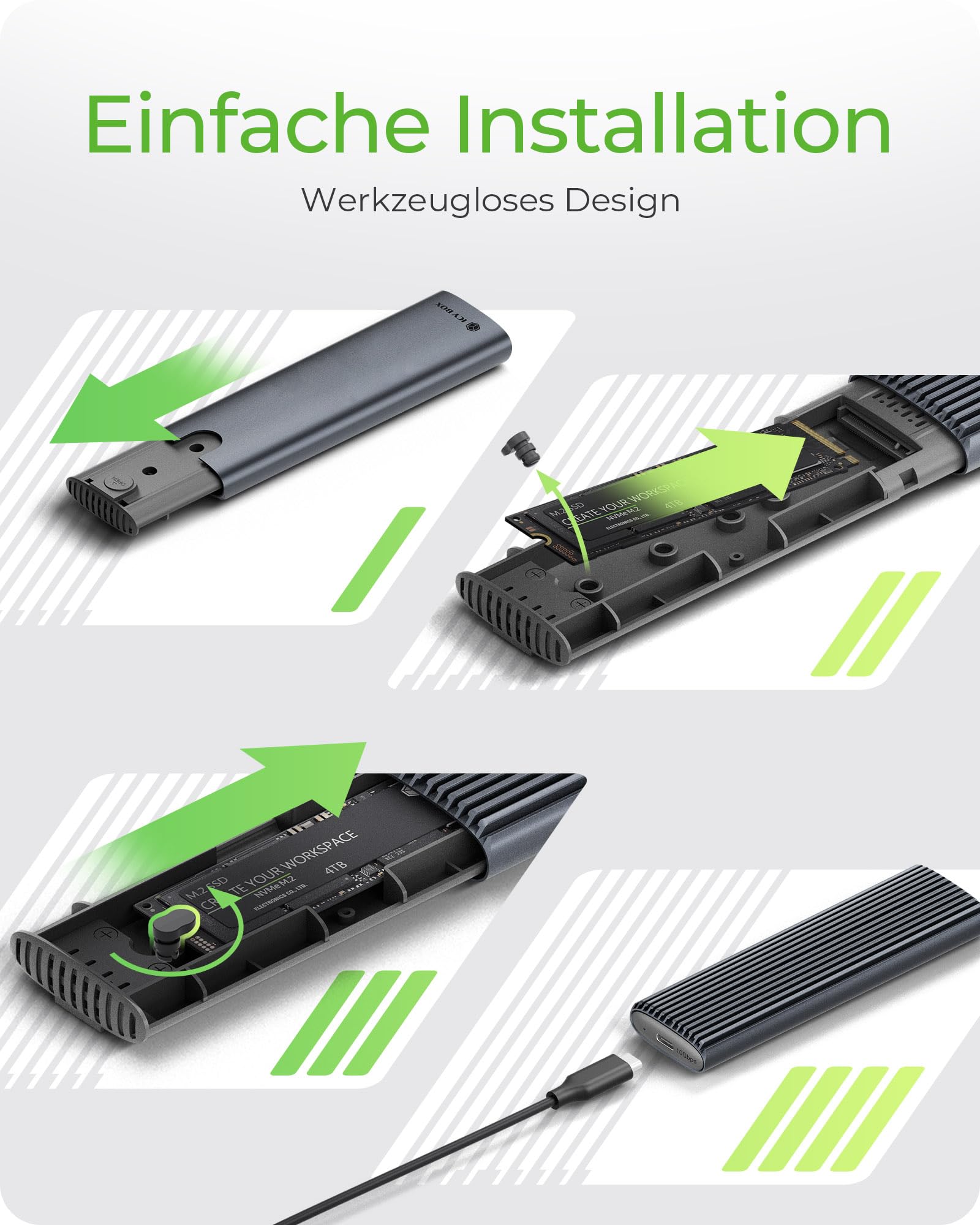 Le ICY BOX Geh. IcyBox simplifie l’installation de votre SSD M.2 grâce à un système sans vis ni outils. Ce montage rapide s’effectue en quelques secondes, idéal pour les utilisateurs qui recherchent la simplicité et la praticité. Vous pouvez ainsi remplacer ou ajouter un SSD en toute tranquillité, sans risquer d’endommager les composants. Cette approche est parfaite aussi bien pour les débutants que pour les professionnels souhaitant optimiser leur flux de travail.