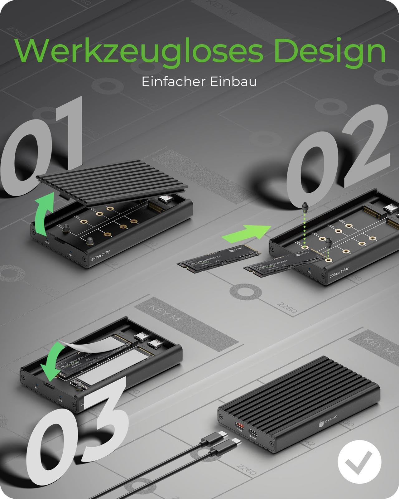 Le boîtier est conçu pour une installation simplifiée grâce à un mécanisme sans vis qui ne nécessite aucun outil. L’encliquetage sécurisé permet d’insérer ou de retirer votre disque dur en quelques secondes, parfait pour ceux qui changent fréquemment de disque ou veulent une solution plug-and-play simple et rapide. Cette fonctionnalité améliore la praticité globale et permet d’optimiser votre flux de travail sans perdre de temps.