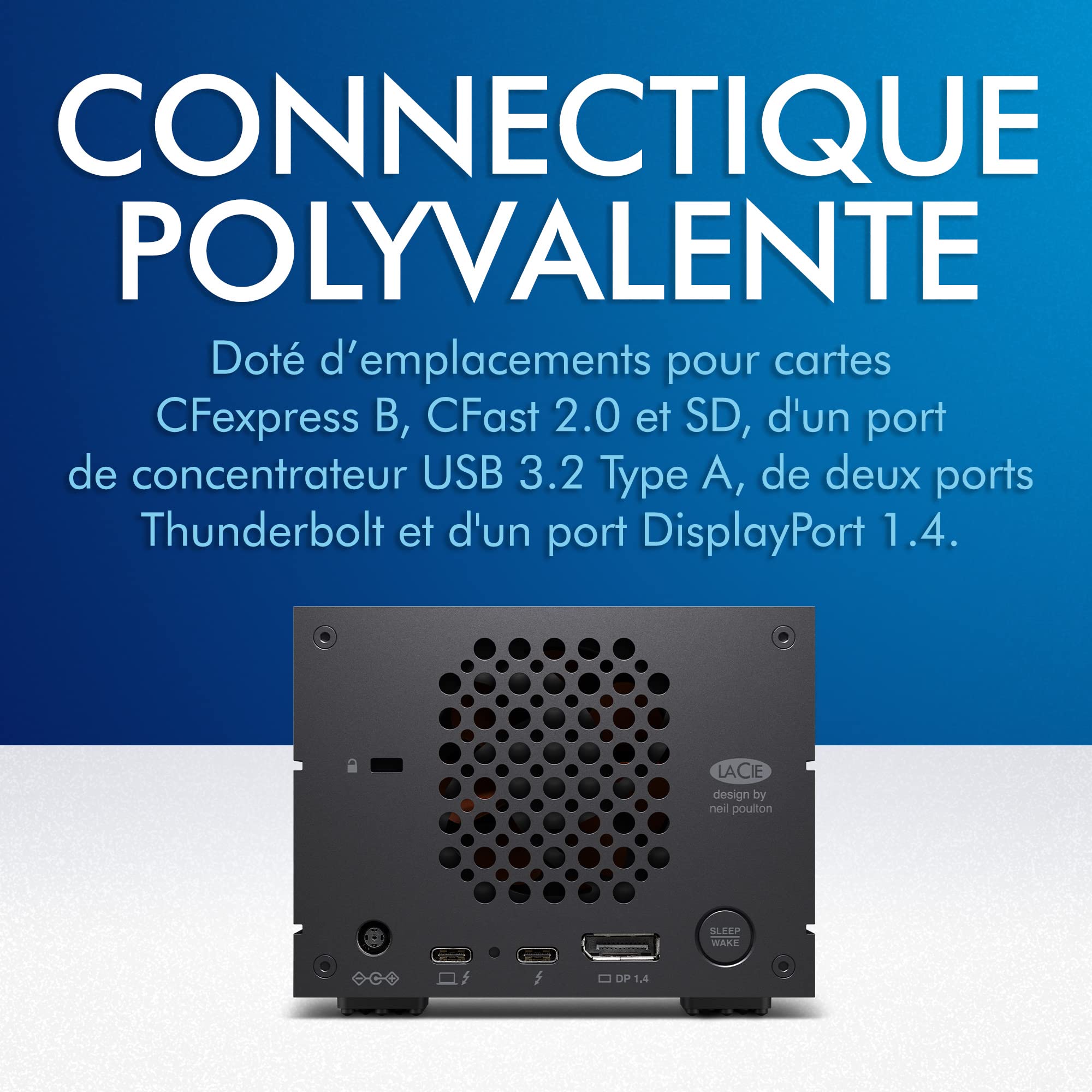 Ce système de stockage est conçu pour être polyvalent et fiable, offrant une solution complète pour la gestion de vos données professionnelles. Que vous travailliez sur des projets créatifs ou des tâches exigeantes en matière de stockage, le LaCie 16TB 2big Dock Thunderbolt 3 répondra à tous vos besoins.