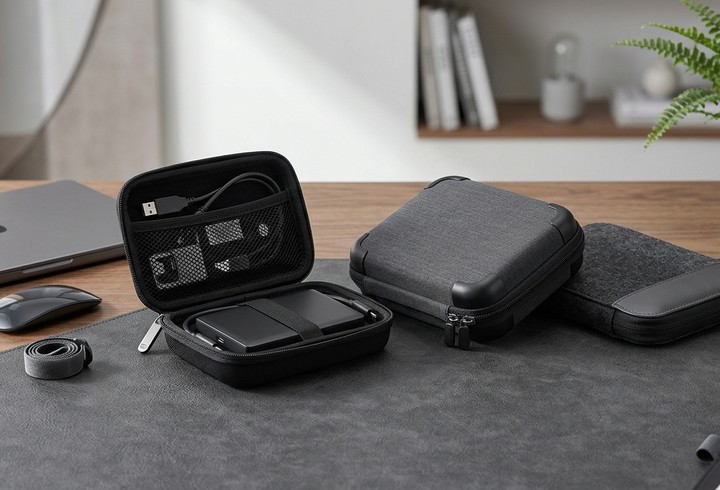 - Compatibilité Universelle : Nos housses s'adaptent aux formats standards et aux nouveaux SSD compacts (Verbatim, MediaRange), avec des compartiments dédiés pour vos câbles USB-C et accessoires.