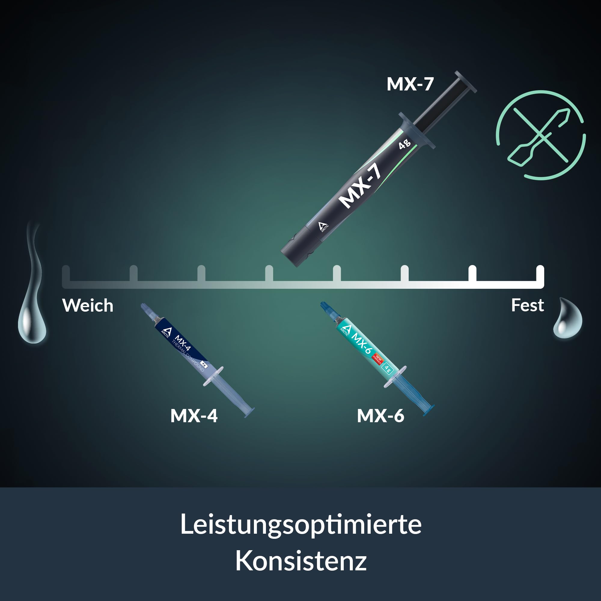 La MX-7 se distingue par une texture fluide non conductrice d’électricité, ce qui facilite sa pose sans risque de court-circuit. Son élasticité et stabilité lui permettent de conserver ses propriétés thermiques jusqu’à 120°C en fonctionnement continu et jusqu’à 150°C en pics occasionnels. Grâce à cette endurance, elle ne sèche pas ni ne se fissure avec le temps, assurant un contact thermique efficace pendant plusieurs années.
