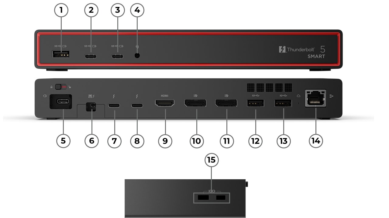 Le Lenovo ThinkPad Smart Dock 7500 est conçu pour être le cœur de votre bureau. Il dispose d’entrées multiples, y compris deux ports Thunderbolt 5, un port HDMI 2.1, et un port DisplayPort 1.4. Ces connexions vous permettent de gérer aisément plusieurs écrans et d’adapter votre installation selon vos besoins, qu’il s’agisse d’une configuration multitâche complexe ou d’une présentation professionnelle. En outre, le dock intègre un port réseau 2.5GbE, garantissant une connexion Internet stable et rapide, idéale pour les environnements exigeants.