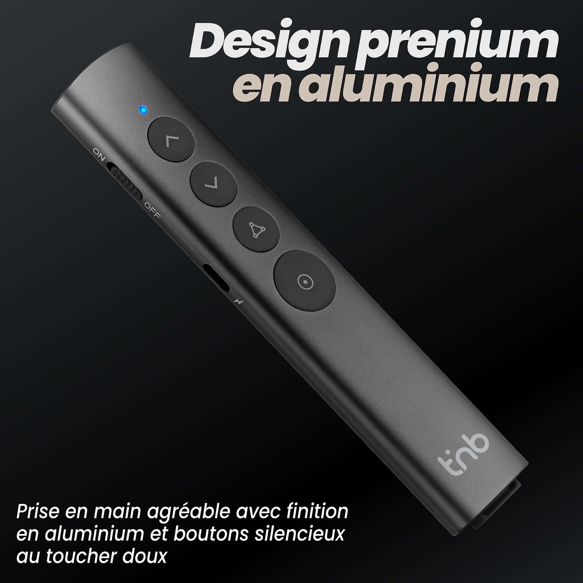 Le design de la T'nB TNB Rechargeable spotlight presentation remote control AIRPRESENTER a été pensé pour optimiser le confort et la maniabilité. Sa forme ergonomique, ses contours arrondis et son poids réduit, avoisinant les 80 grammes, favorisent une prise en main naturelle et prolongée, réduisant la fatigue lors de longues séances. La disposition intuitive des boutons, précisément calibrés pour une réponse immédiate, permet une utilisation aisée, même lors d'une présentation dynamique avec multiples manipulations. Ce design moderne est le résultat d’un équilibre parfait entre fonctionnalité et esthétique, garantissant que chaque intervention soit précise et fiable dans tous types de milieu professionnel.