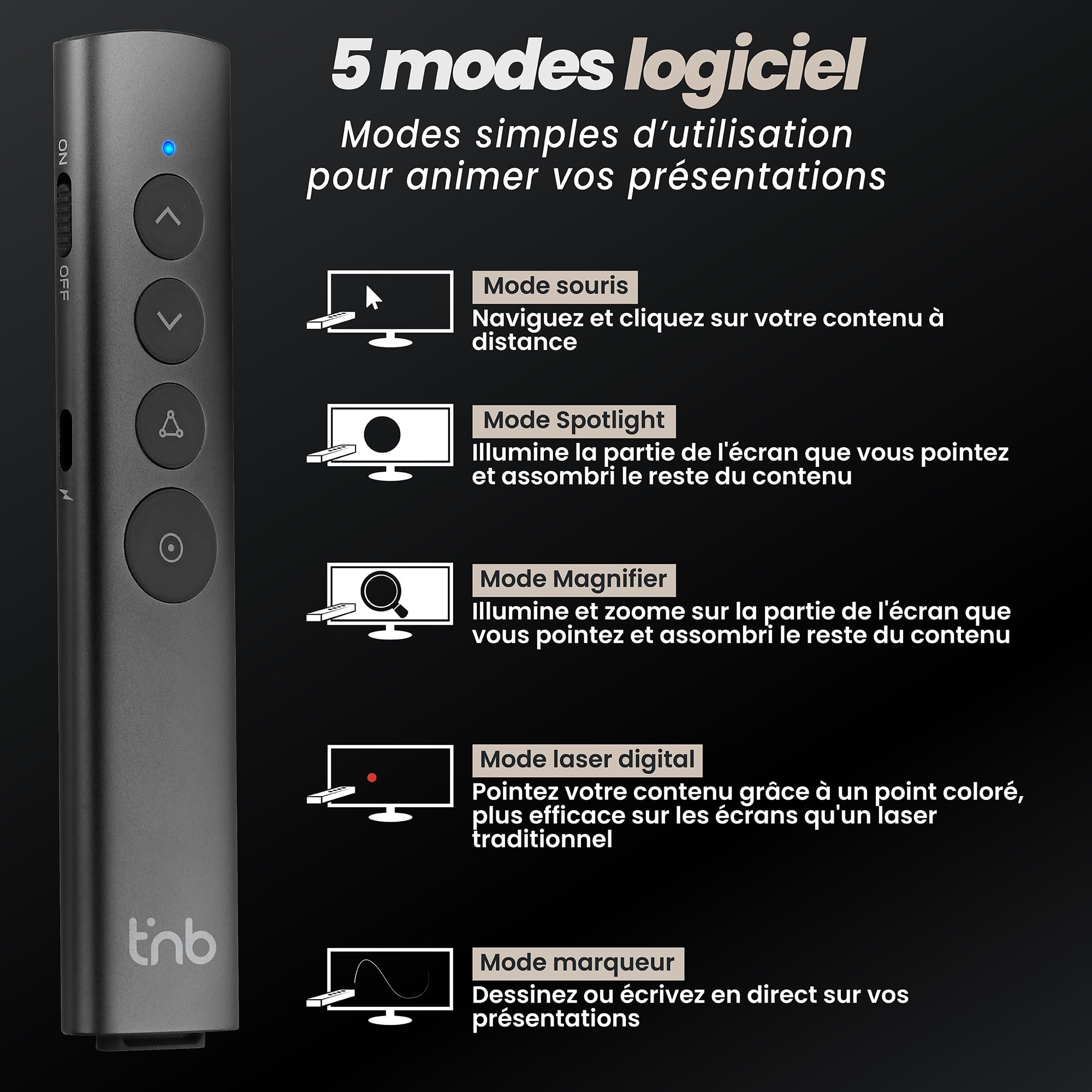 La T'nB TNB Rechargeable spotlight presentation remote control AIRPRESENTER se distingue par son interface de contrôle multifonction qui simplifie la gestion des présentations. Dotée de boutons configurés pour changer de diapositive, déclencher des animations ou activer des minuteries, elle offre une réactivité sans faille et une navigation intuitive tout au long de votre exposé. Chaque commande est conçue pour répondre immédiatement, créant ainsi une interaction fluide entre l’utilisateur et l’appareil. La précision des commandes est accompagnée d’options programmables qui permettent d’adapter l’outil à divers scénarios d’utilisation, garantissant une expérience utilisateur adaptable et complète dans n’importe quelle configuration professionnelle.